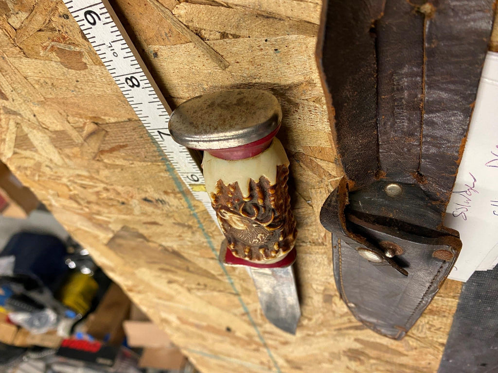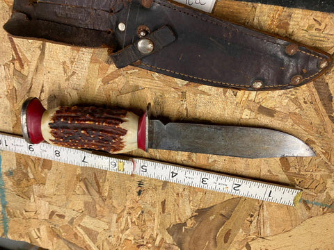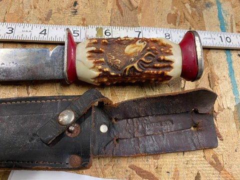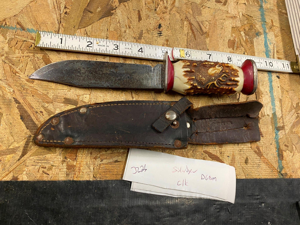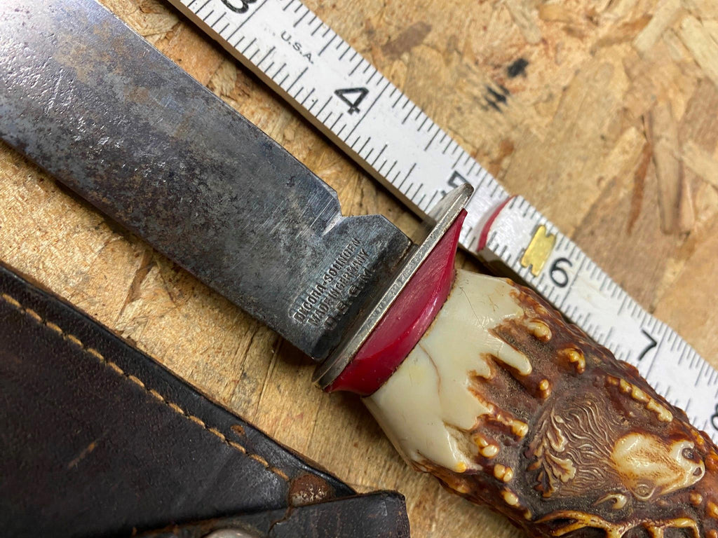 Vtg Solingen Fixed Blade Hunting Knife Elk 5" Blade Leather Sheath Germany Fancy handle