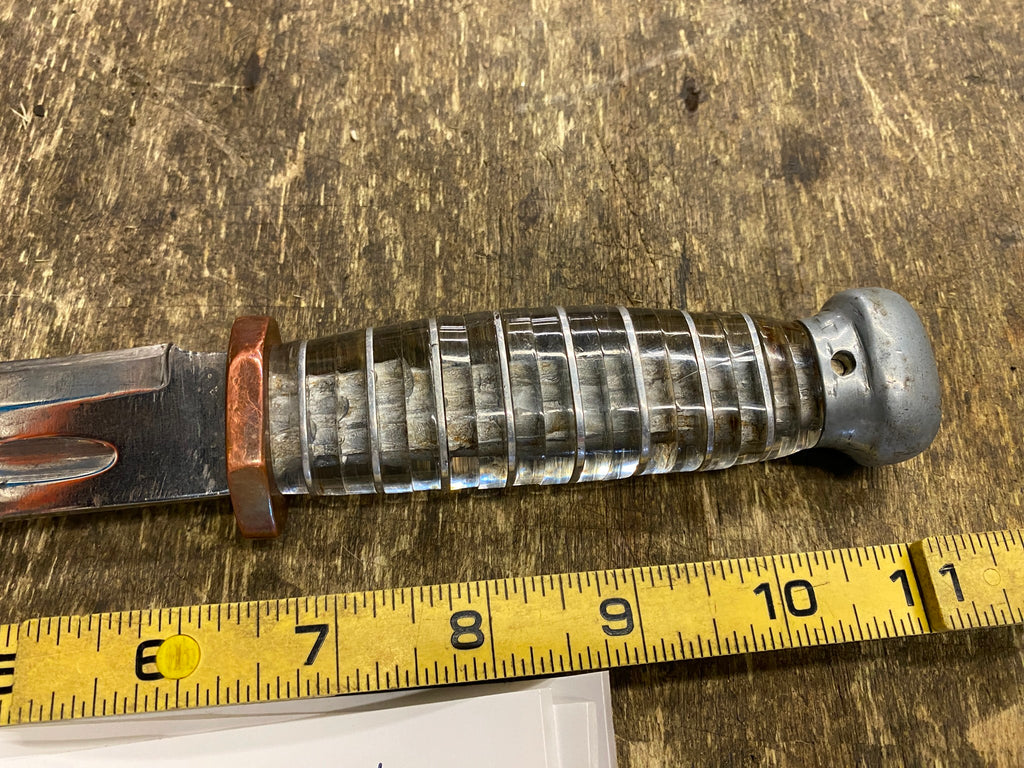 WWII Original PAL RH 36 Combat Fighting Knife Plexiglass Fuselage Canopy Pilot!   bought this and a pistol from an old timer    many moons ago.   said he was shot up in combat  they got his canopy    he took some pieces of the shot up one & made a handle for his knife & his pistol out of them    guessing its old lexan?    sorry not sure what kind of airplane or where he was shot up   but still pretty cool item!   little history with it!