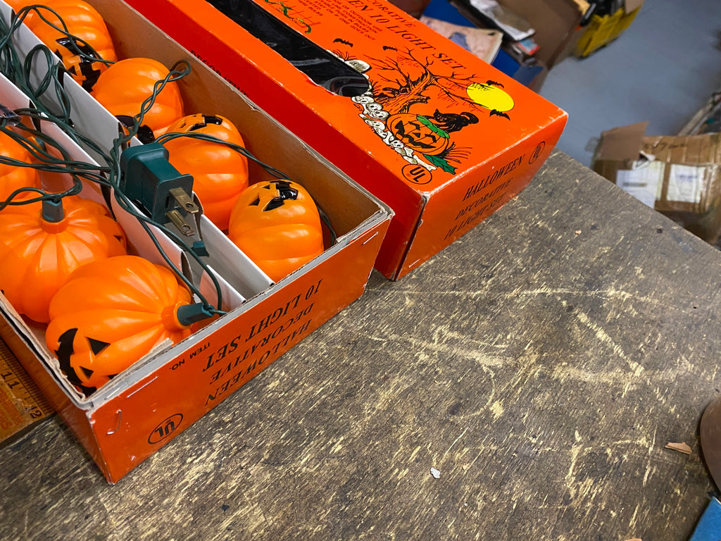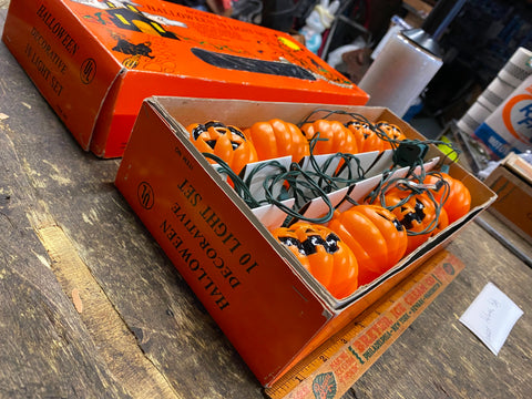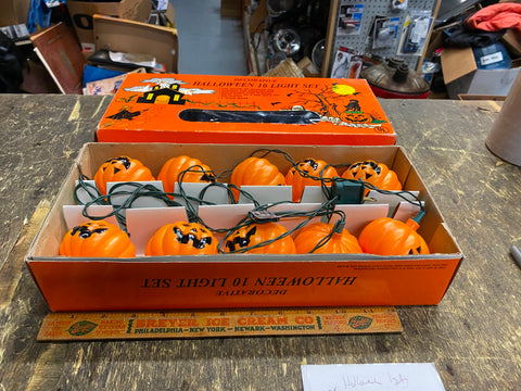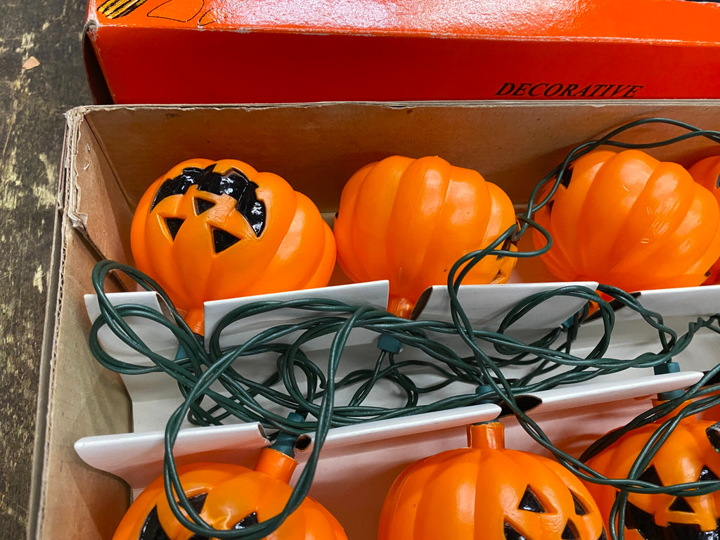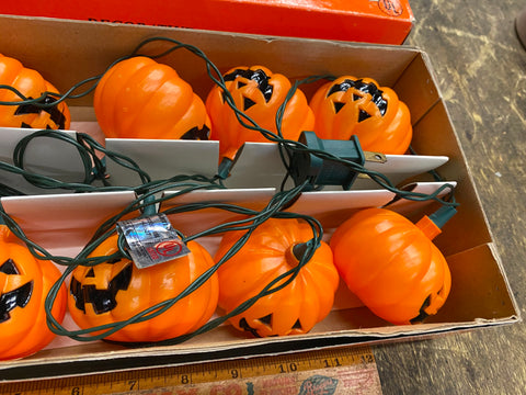 Vtg Jack O lantern Pumpkin Blow Mold String Lights Halloween Decor Set Orig Box! Have a bunch of halloween stuff listed!