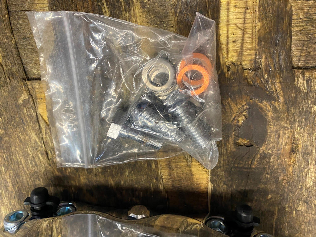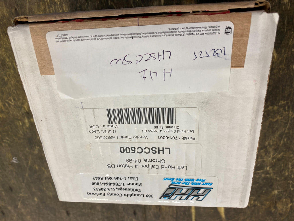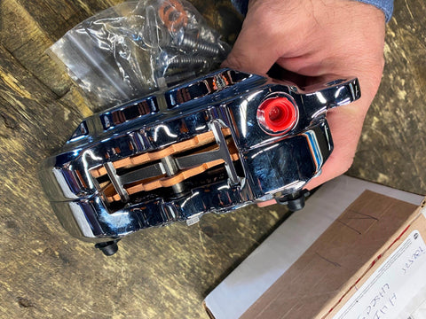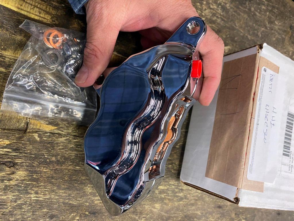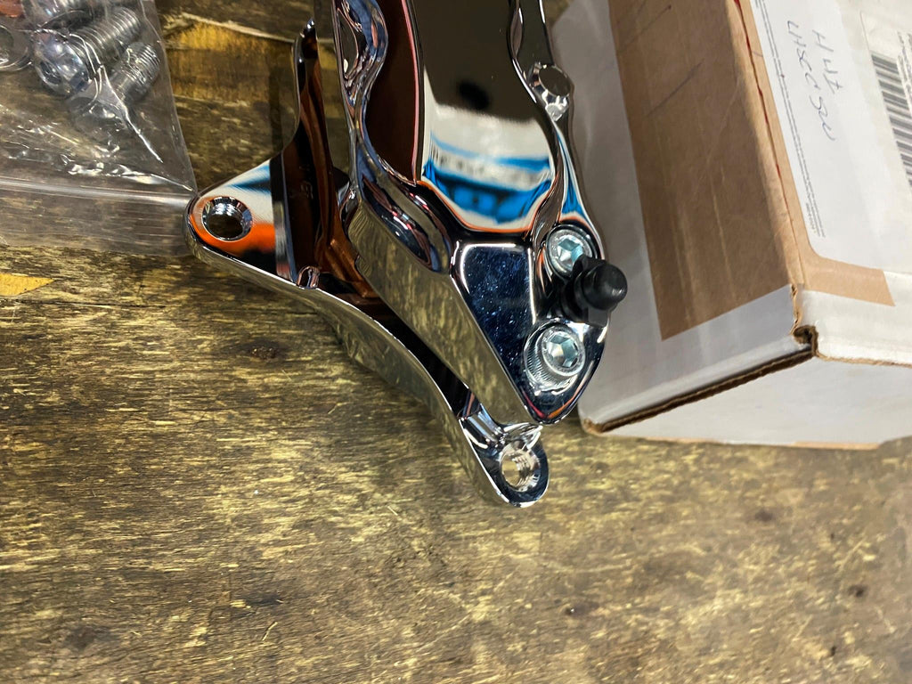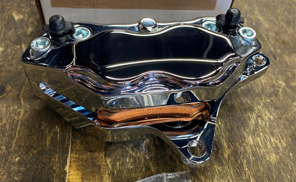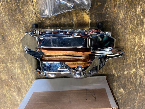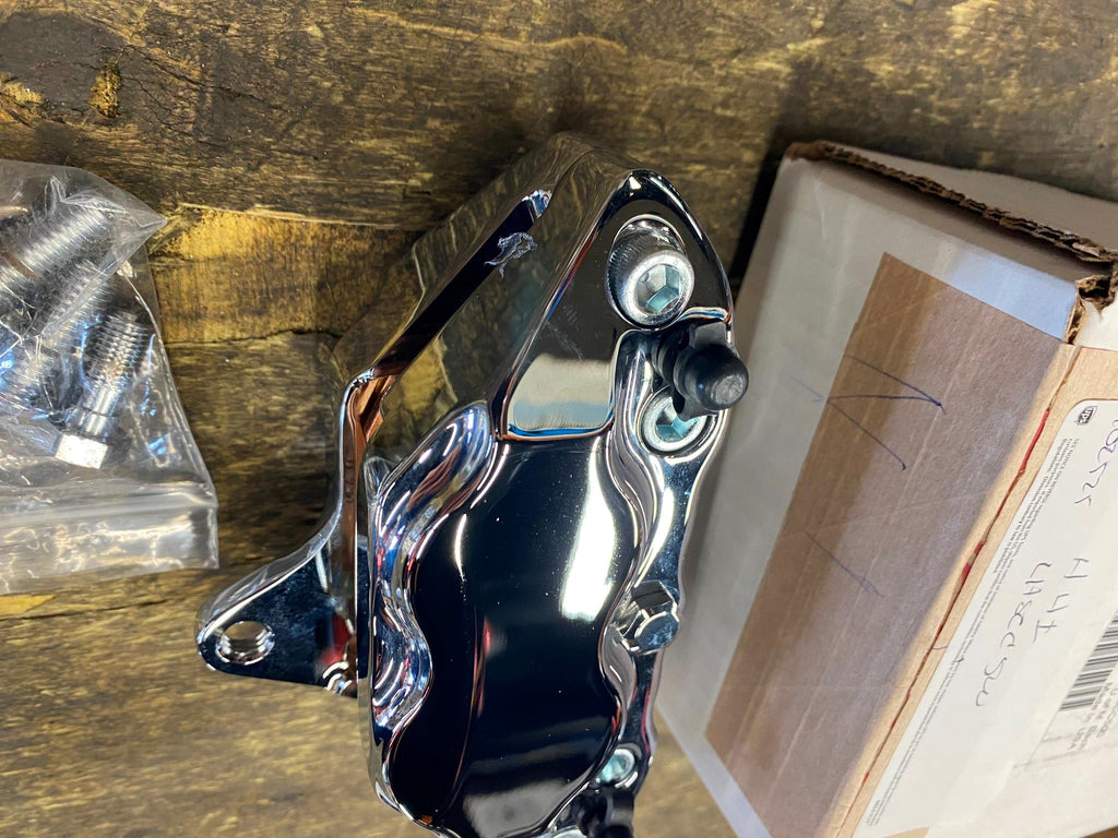 | 4 Piston Front Caliper 84-99 Hawg Halters Chrome Harley Softail Dyna Sportster touring left side. |