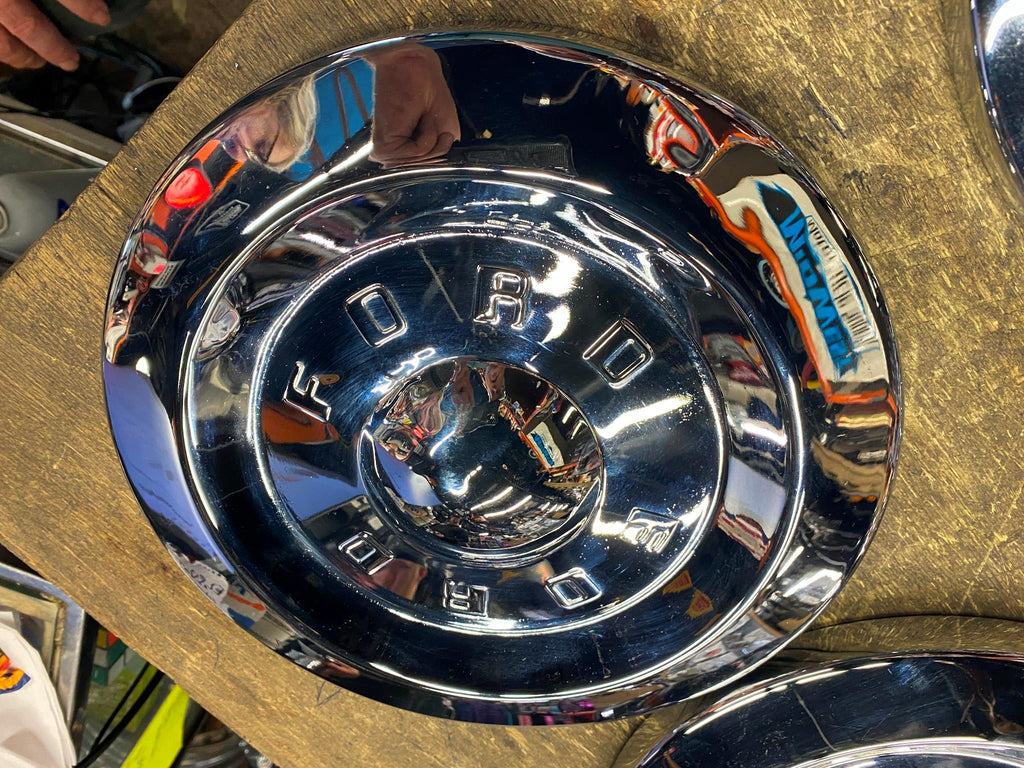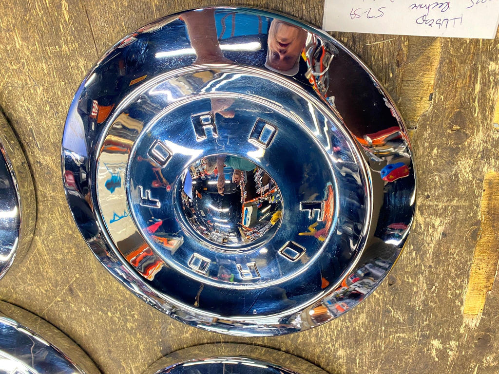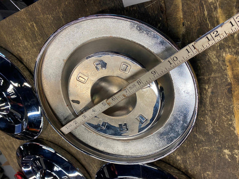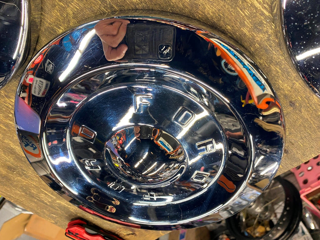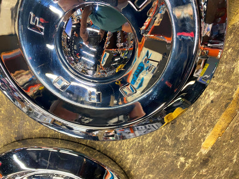 - OEM 1957 1958 1959 Ford Hubcaps Ranchero Fairlane Galaxie 300 Hubcaps Dog Dish Factory hubcaps guy had them rechromed decades ago couple have some blemishes & pitting nice set of vintage hubcaps!! selling as pictured.