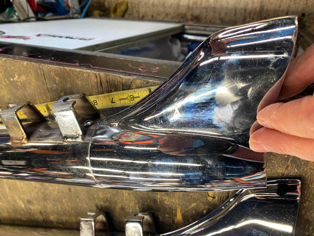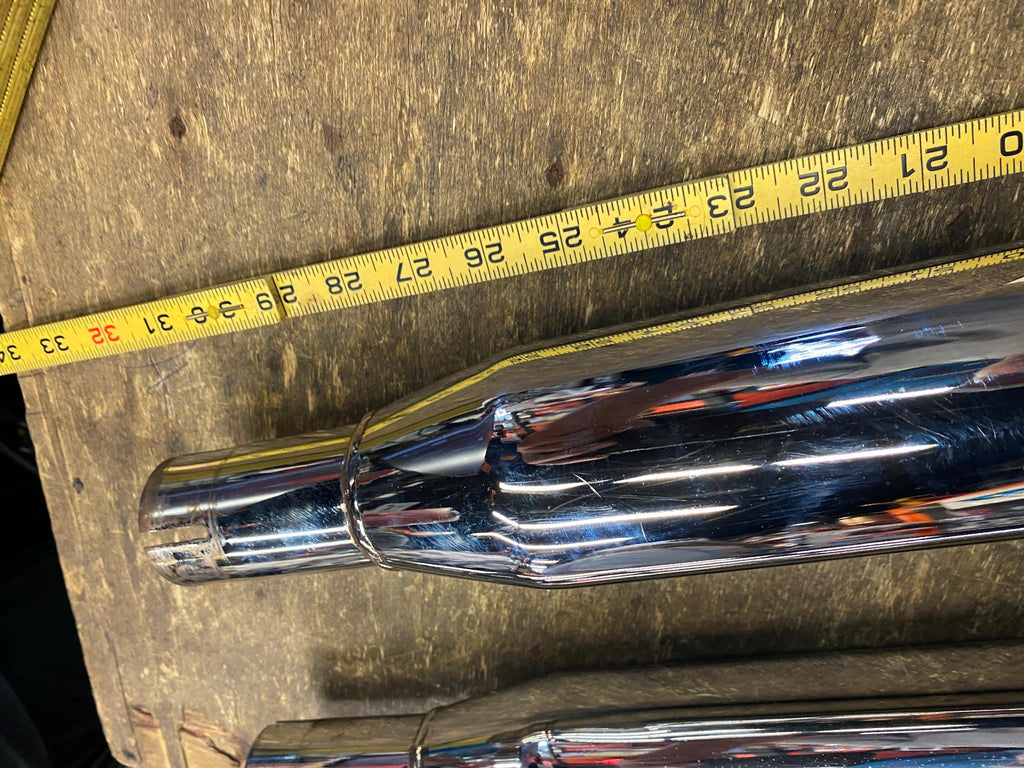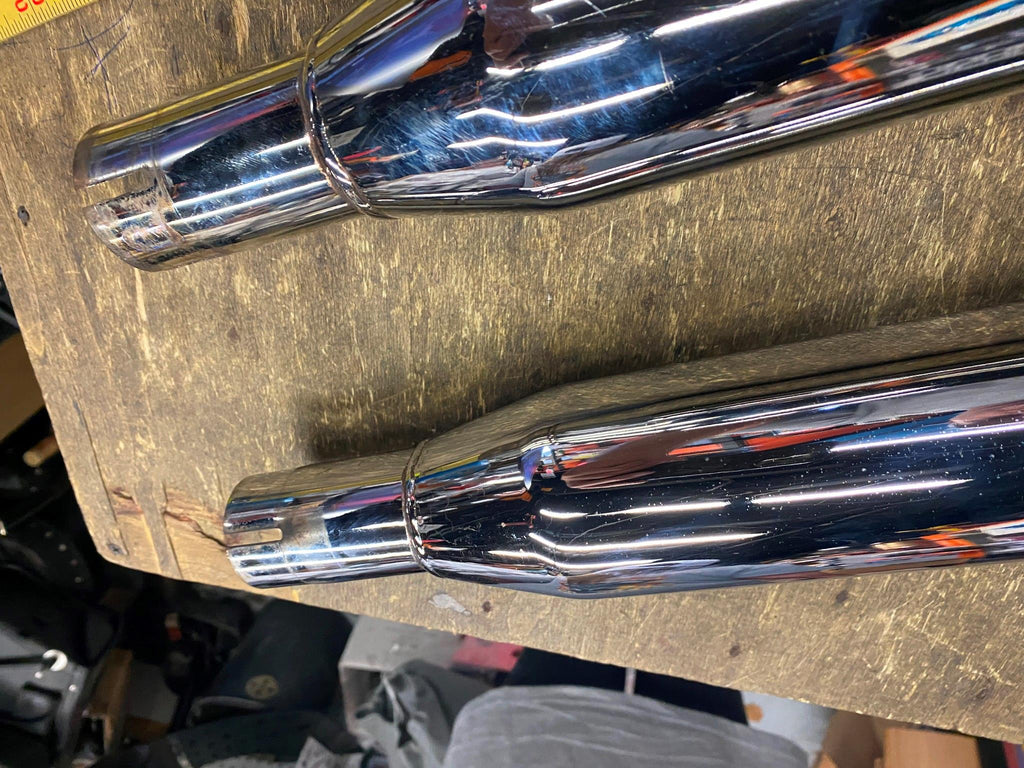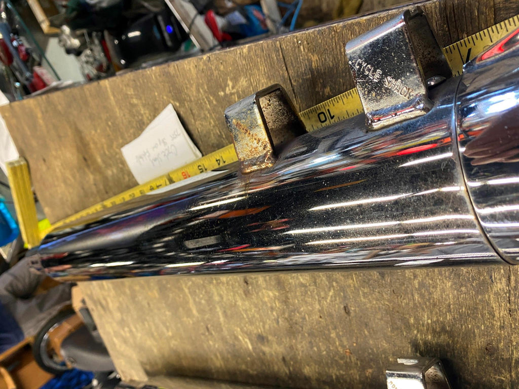 OEM Harley Fishtail Rocket Slip on mufflers Touring FLH Ultra classic Glide 95-2016 Evo & twin cam models some wear & tear cycle shack exhaust made in usa some pitting on one muffler