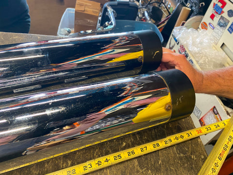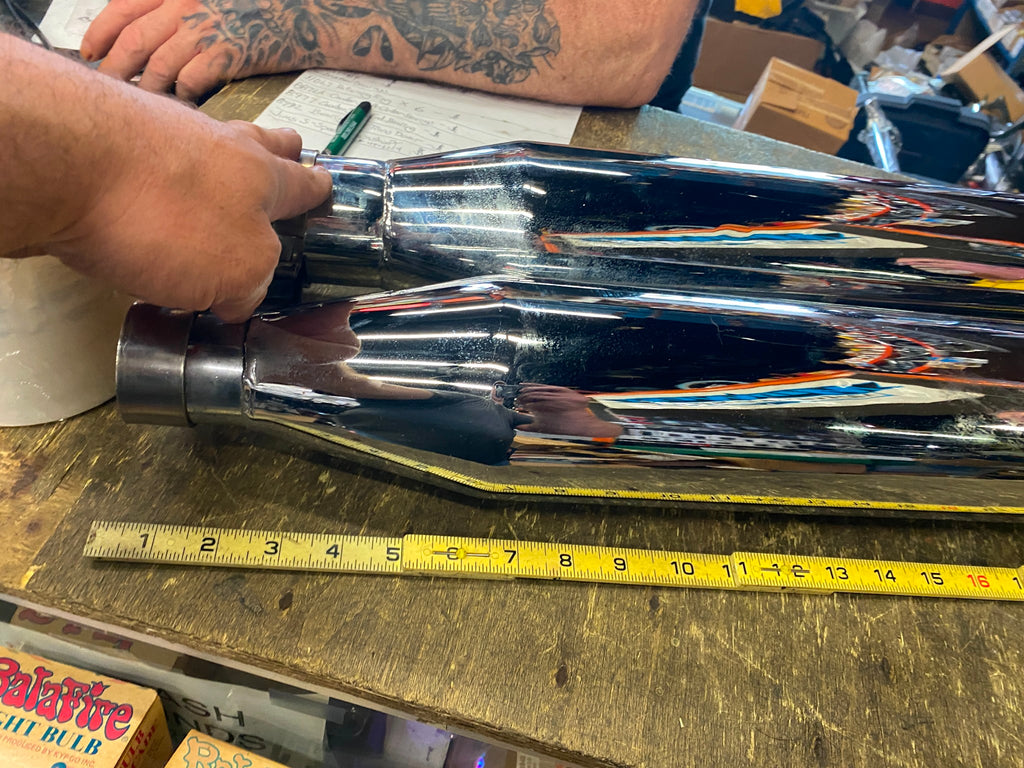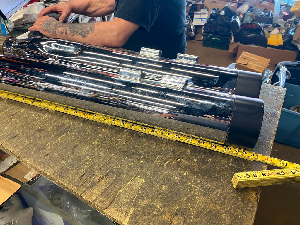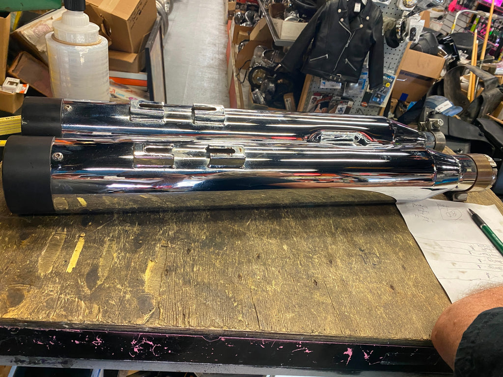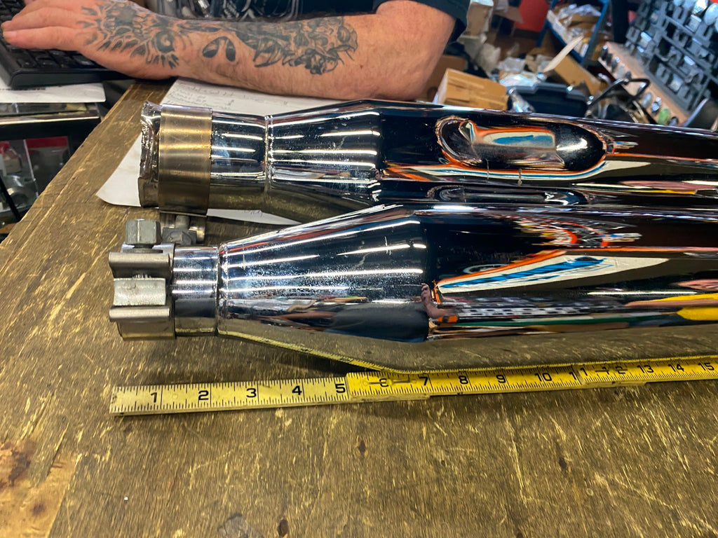OEM Harley Shark Slip On Mufflers Touring FLH Road King Ultra Road Stre Glide M8 pretty clean slip on end is beat up (customer had a hard time taking them off)