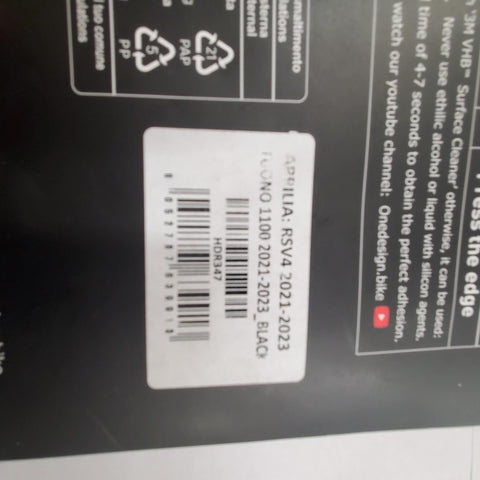The OneDesign HDR347 tank grip is specifically designed for Aprilia RSV4 and Tuono V4 models from 2021 to 2024.