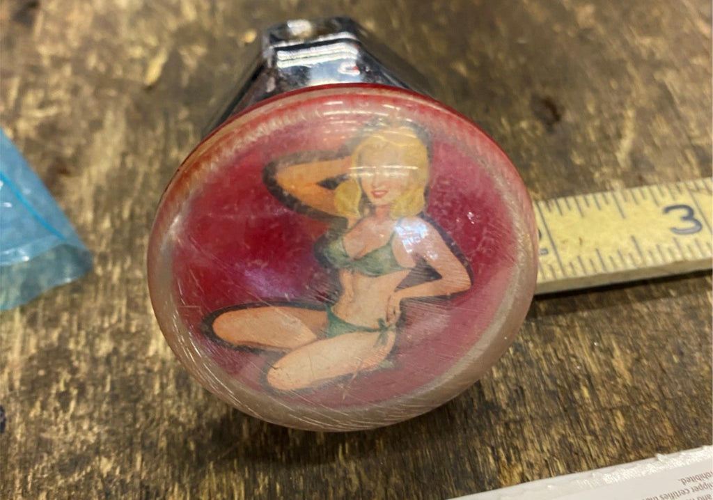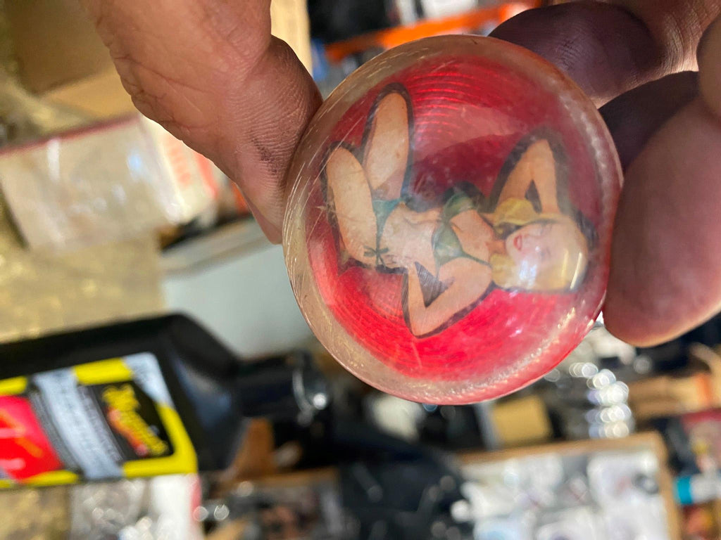 Vtg 50’s Hot Girl steering wheel spinner suicide knob Hot Rod Tractor Red Auto Truck     Really cool one with a girl in a bikini     needs a strap & holder...   Great piece for your old hot rod!! or display!!