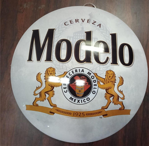 This listing features an original, officially licensed Modelo Cerveza round metal dome sign. It is a popular piece of breweriana designed for decorative use in home bars, man caves, and other spaces. The sign appears to be in new or excellent condition, with vibrant colors and crisp details [1.1, 1.3].
