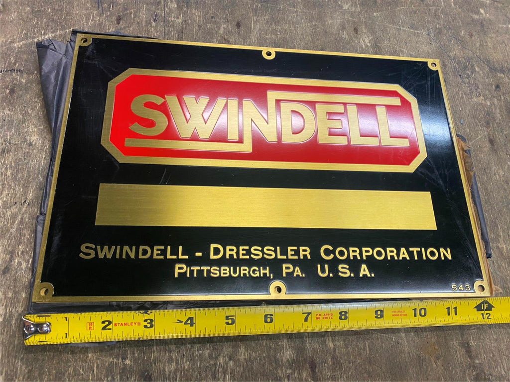 Vtg NOS Swindell Dressler Brass Sign 12x8 Heavy Man Cave Garage Machinery Pgh PA they Make kilns & large equipment for ceramics..... buddy of mine found some old signs that were never used, guessing 19505's 1960's Brass very nice quality! Great Sign With pittsburgh on it, Great for the man cave, gameroom, Believe this is the tag they would bolt onto their large equipment. look at last picture, thats how thick it is!!!