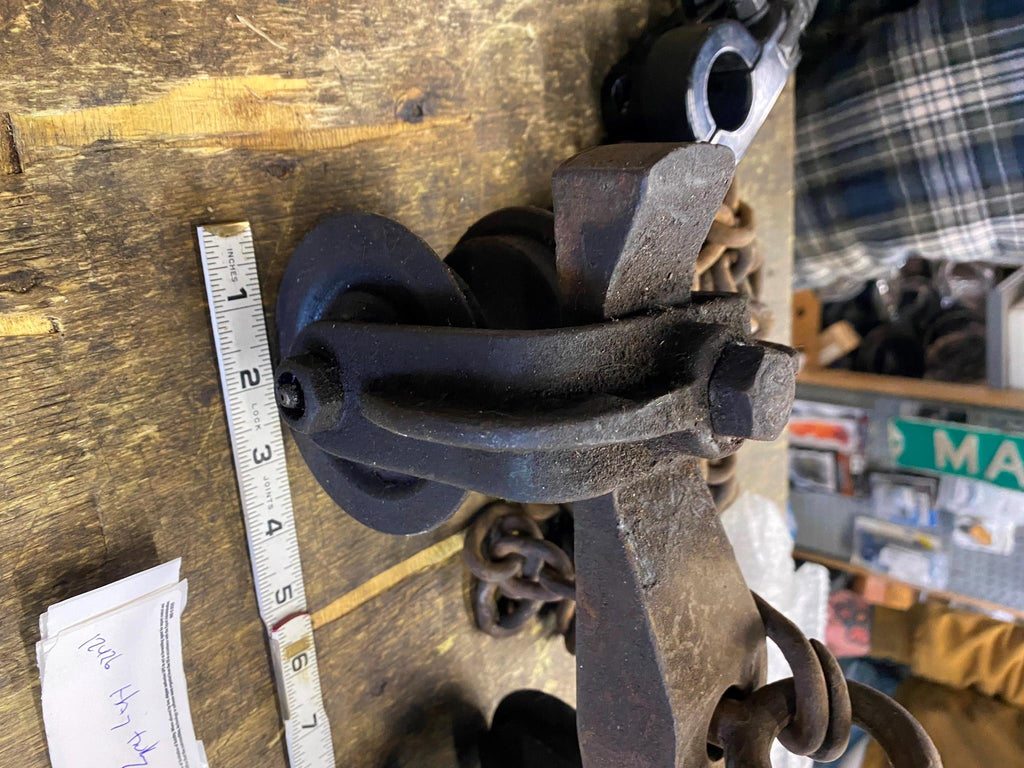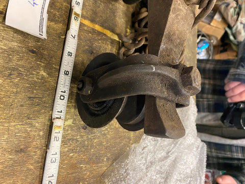 1910-20 antique american industrial cast and/or louden wrought iron hay barn trolley rope pulley and oversized hook
