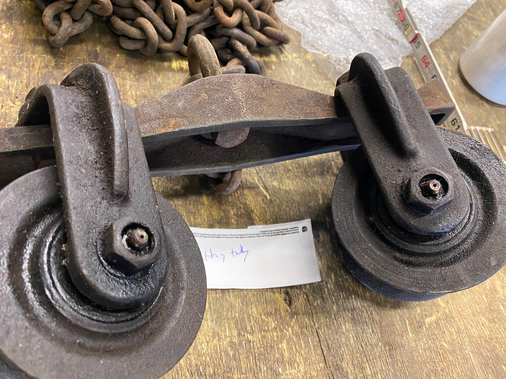 antique industrial cast iron hay trolley or carrier, used on farms to move hay into barn lofts.