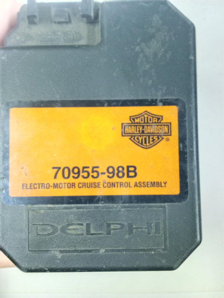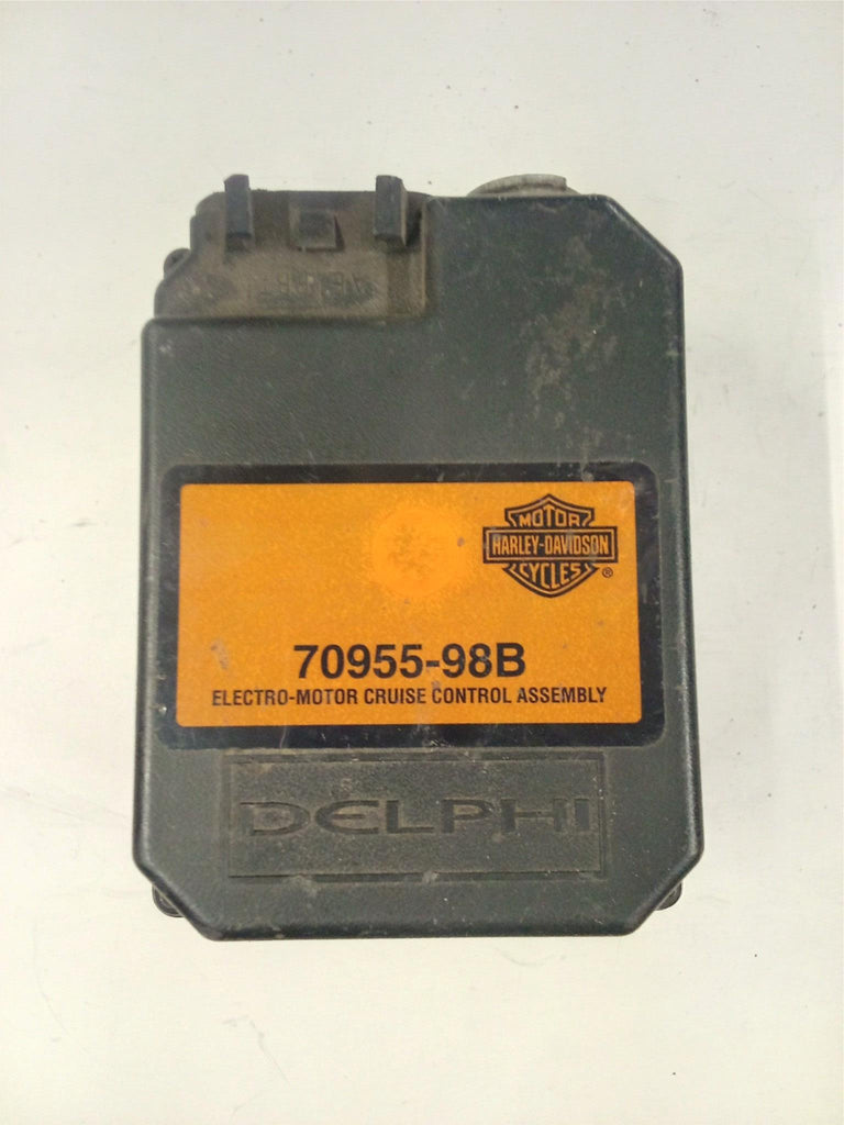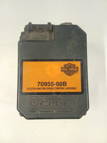 The item is a Harley-Davidson Electro-Motor Cruise Control Assembly with part number 70955-98B. This genuine OEM part was manufactured by Delphi and is used on Harley-Davidson Touring models from approximately 1998 to 2003.