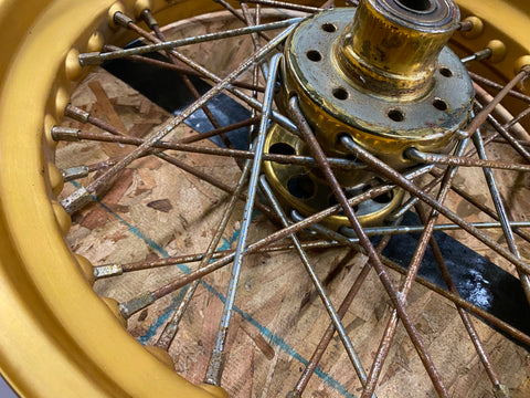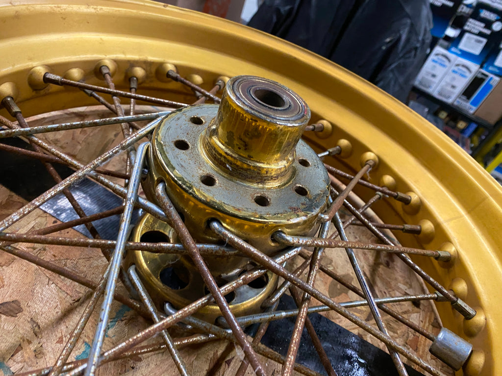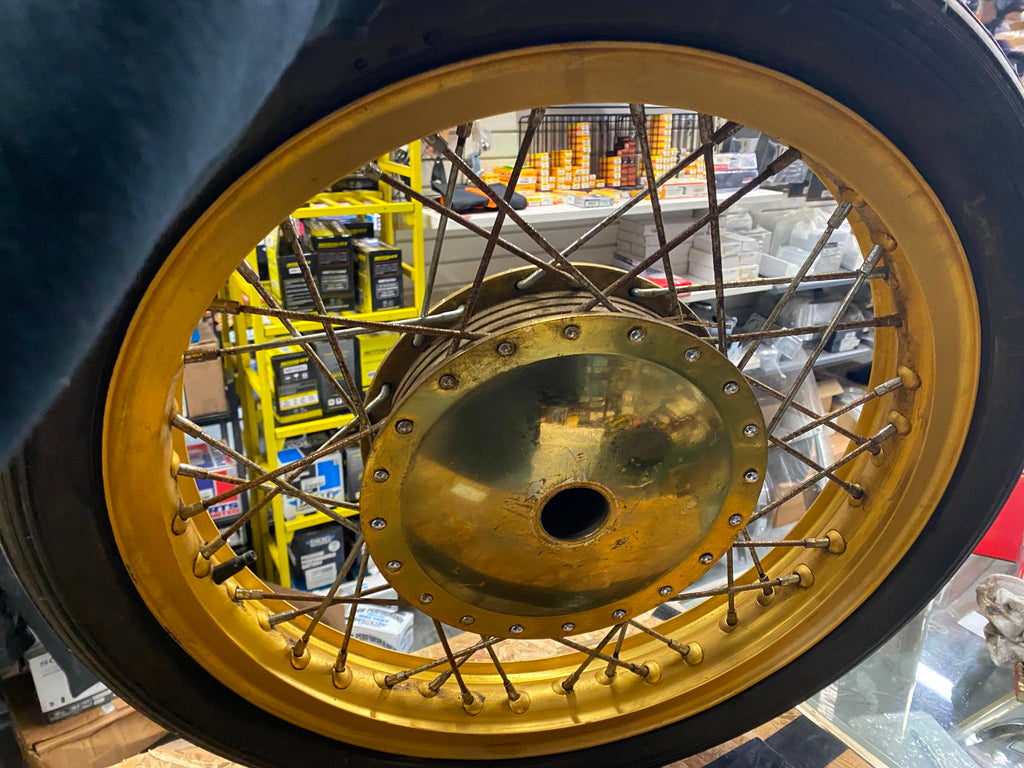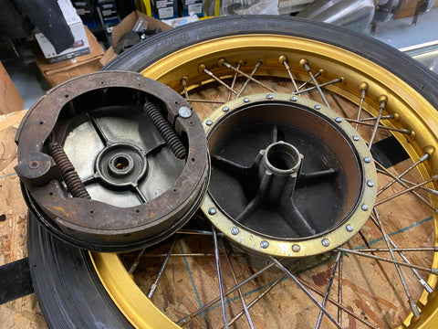 Custom Spoke Wheels Hamburger Harley Ironhead Shovelhead Akront Front Rear Drum brake fits 57-78 sportster rear 64-72 sportster shovelhead front hubs were gold plated akront rear rim 3.5x16 front is a 2.5x19 High shoulder some of the spokes clean some wont. Great look!!! Saw them & had to own them!