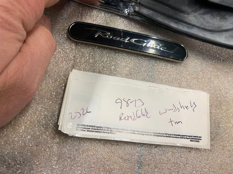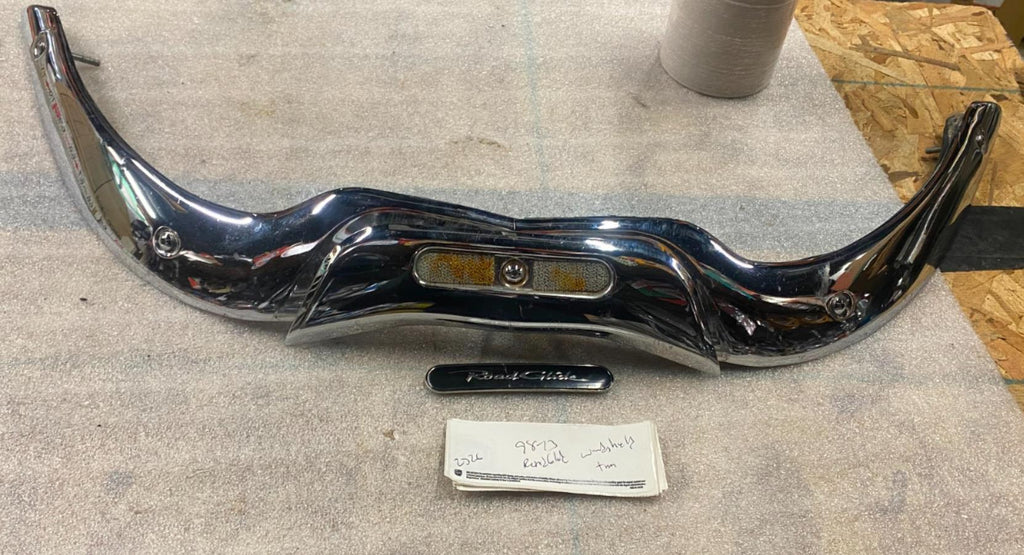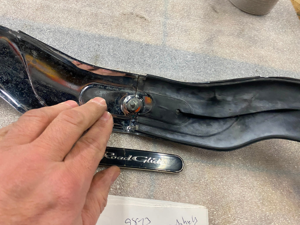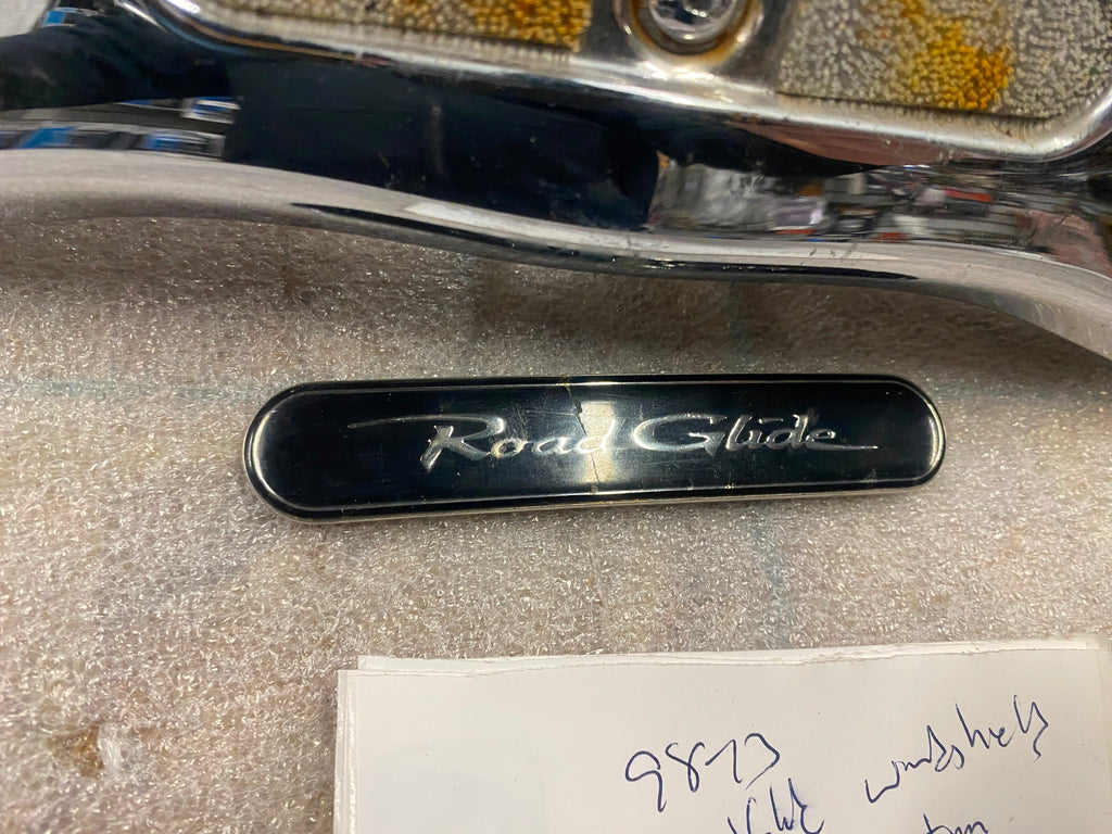 OEM Road Glide Windshield Trim Chrome 1998-2013 Harley FLTR Fairing 58519-07A   will need some new adhesive or hook & loop for emblem   emblem has a crack  may dissasemble to ship