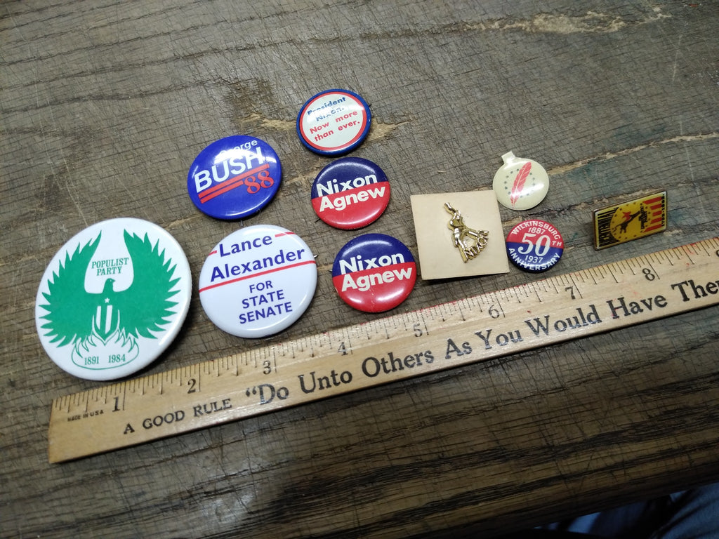 ***PLEASE LOOK AT ALL THE PICTURES AND ASK QUESTIONS BEFORE BIDDING*** This is a Vintage 10 Pc Lapel Hat Pin Lot Democrat Party Nixon Agnew Bush Populist Party 1891-1984. *** The pictures are a substantial part of the description so please examine all the photos and contact me if you have any questions. We will be happy to save you shipping costs by picking this up at our shop. Thank You 061725- RK-06