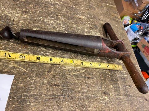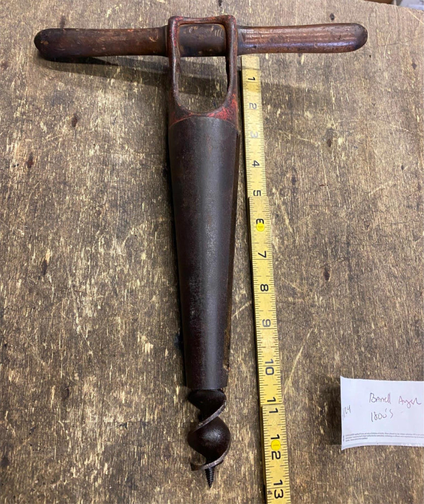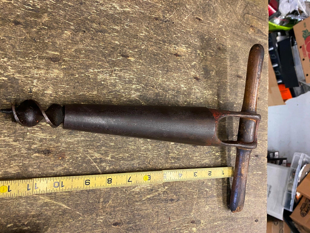 1900's T-Handle Tapered Auger Barrel Keg Bung Hole Wagon Wheel Hand Vtg Tools! told it was used to drill the holes in wine barrels then pound the valve in........... pretty cool! Great display!!