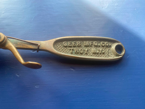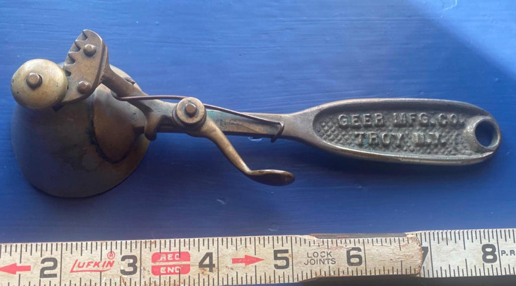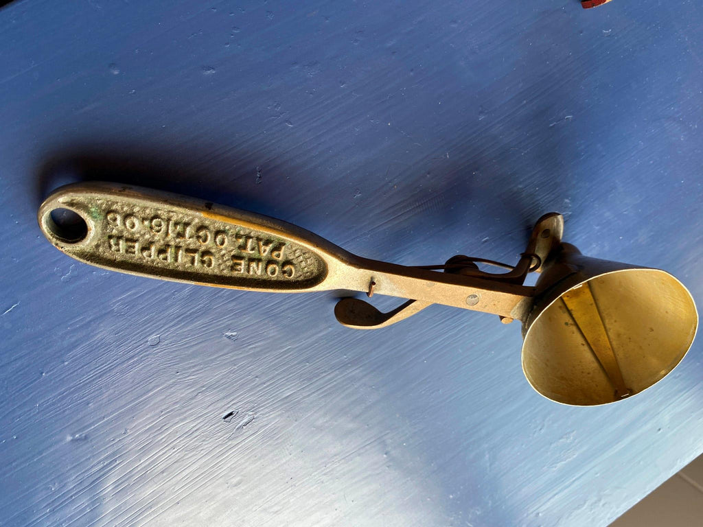 ANTIQUE GEER CLIPPER ICE CREAM DISHER 1906 Geer Mfg. Co., Troy, N.Y. Patent filed February 26, 1906 and issued October 16, 1906 Inventor: Rasmus Nielsen of Troy, N.Y. Material brass Length 9 inches Bowl - Conical Back handle marked "Geer Mfg. Co. Troy, N.Y. Front handle marked "Cone Clipper Pat. Oct. 16, 1906" "THE INNOVATIVE ERA" The first decade of the 20th Century was an important era of innovation and change for the country as well as the ice cream industry. There was a huge wave of immigration and with it came new ideas, changes and improvements. The ice cream cone was invented in 1904 and at least 32 ice cream dishers were patented this decade with a variety of different styles. Making 1900-1910 "The Innovative Era"! This disher is conical shaped making it rare and harder to find than the round dishers. Has a hole in handle for hanging, Would be a great display for the Soda jerk!!!