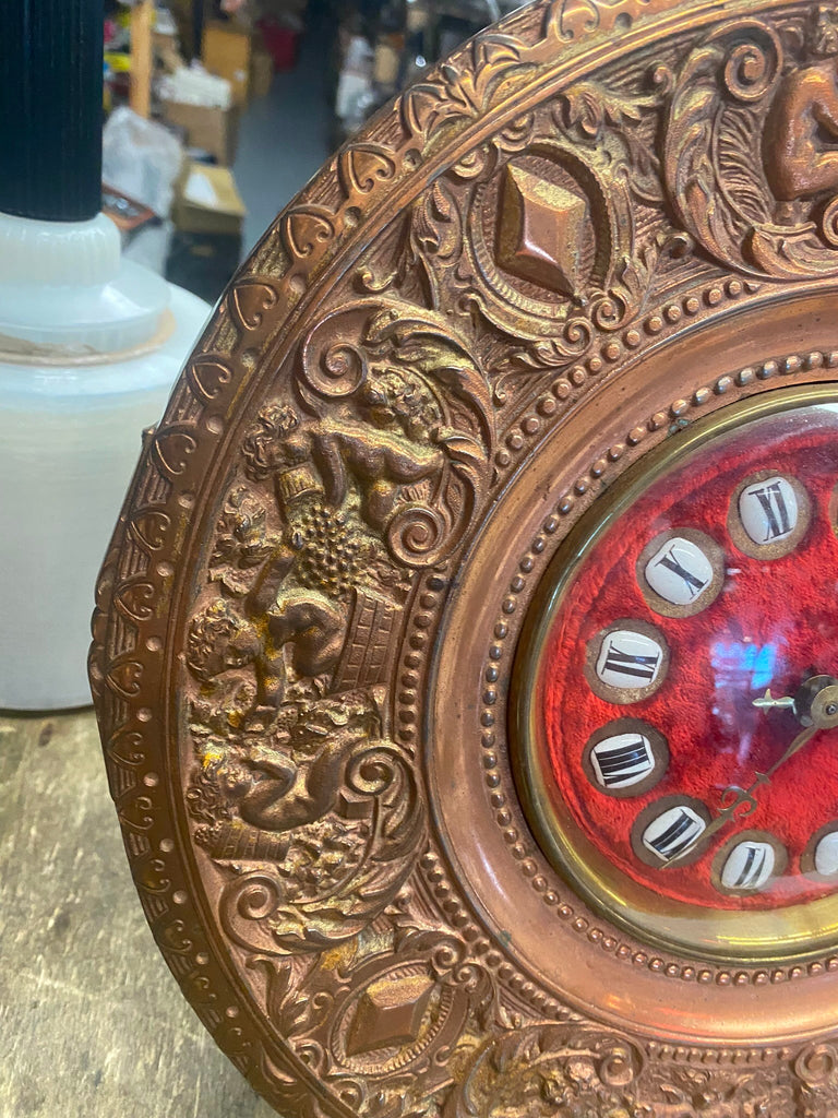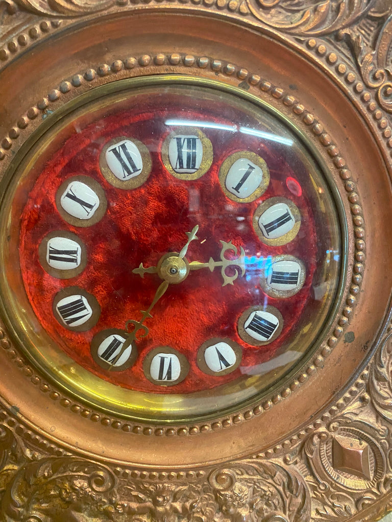1920's Cupid Red Brass Velvet Leather Clock Antique Rare! Mantle Wind up Victorian Beautiful clock, Heavy Brass....