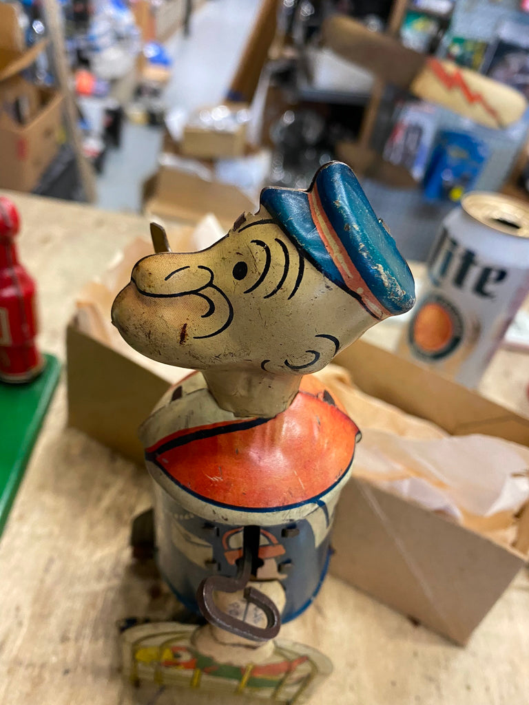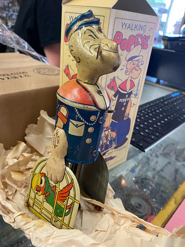 We have for you this highly desirable tin, lithographed, windup “Walking Popeye” in box manufactured by Louis Marx & Company of New York City, New York.