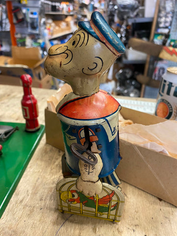 When wound with his dedicated key Popeye walks forward carrying his parrot cages. In working condition but it takes a slight push to make him walk when on a surface. His mechanics work when holding him off the ground.