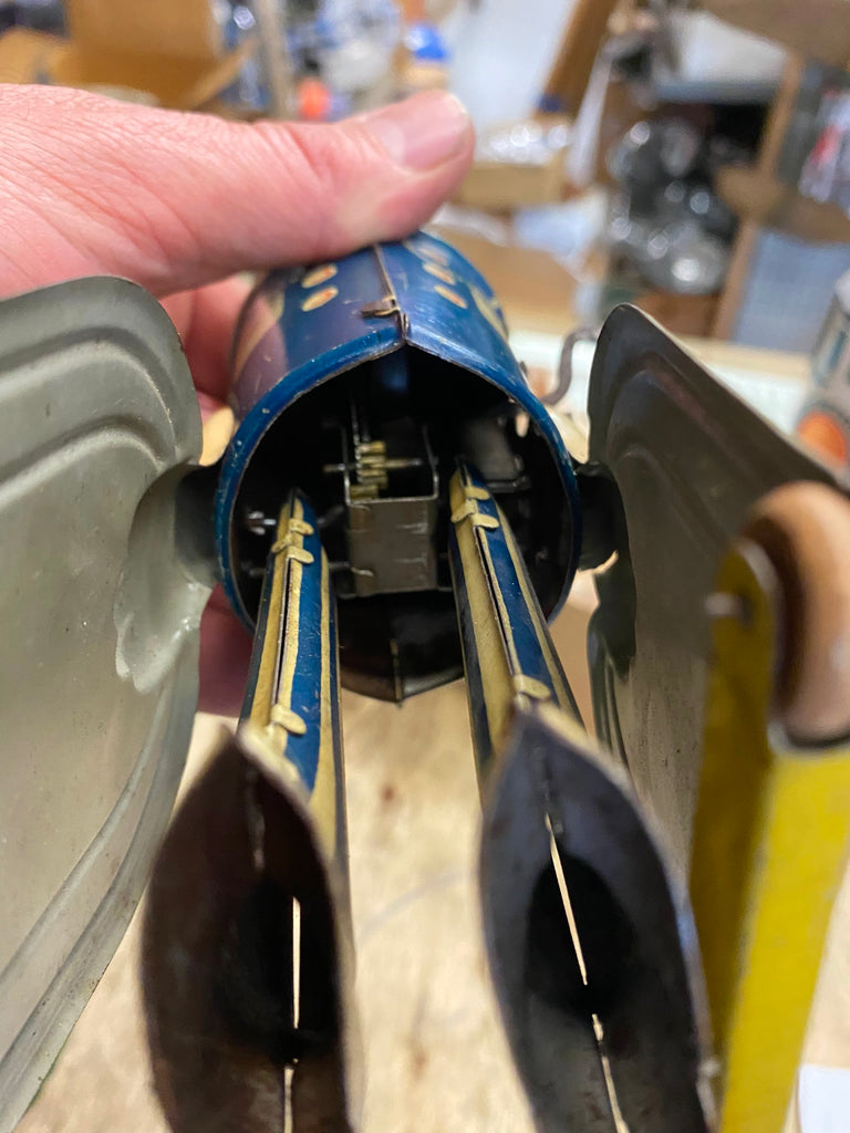 nice piece unrestored, restorations, This piece shows the usual patina, fading, dust, chips, scuffs, surface rust, scratches, missing accessories and wear that are to be expected from age and play. This is approximately 8 ¼” H. We invite you to view the photos to further determine quality and condition.hands have a crack starting. Overall a really nice example or a survivor Depression toy!! its a repop box.... original box fell apart.. nice collectors piece!!