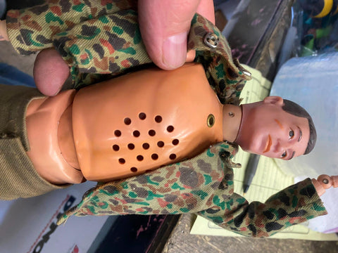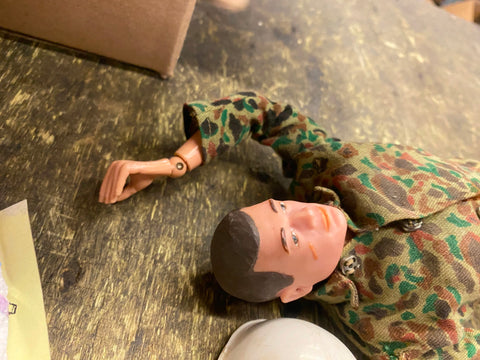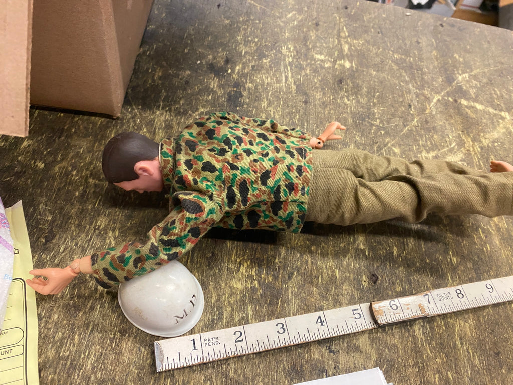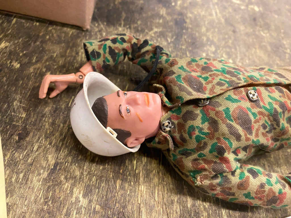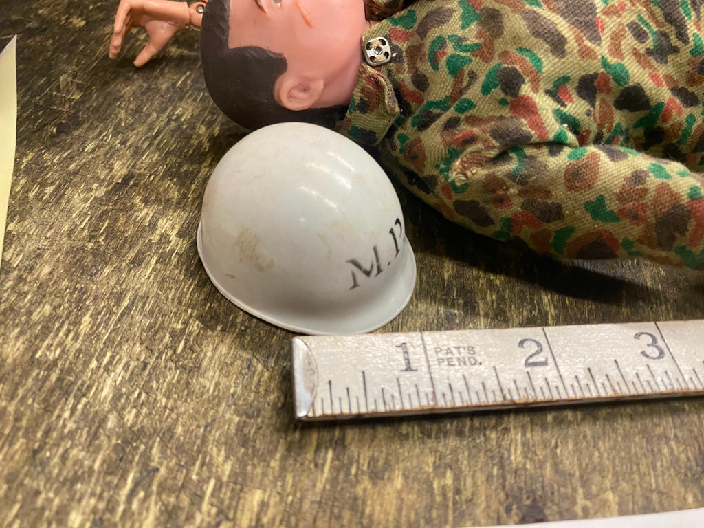 1964 Gi Joe Action Figure Marine Rare Talking Outfit MP Military Police Helmet! no cord seems to be in good condition left the outfit on him Nice MP helmet strap needs reatached on one side, button missing on shirt.
