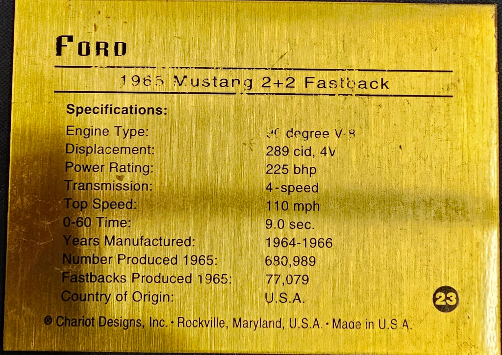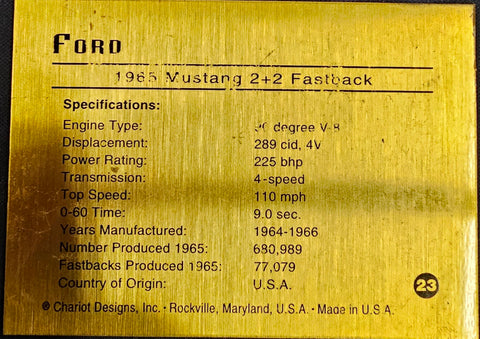 1965 Ford Mustang 2+2 Fastback Gold Plated Specifications Collectible Plaque