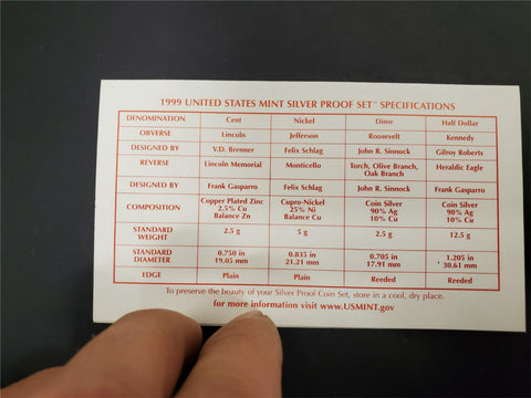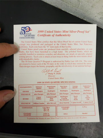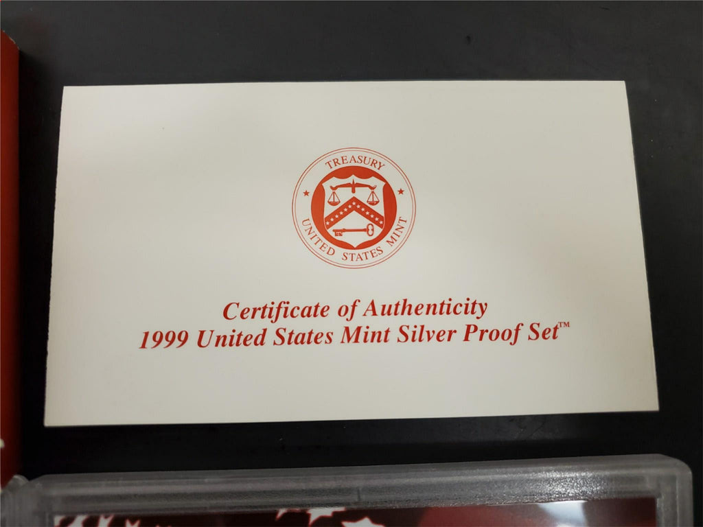 1999 United States Mint Silver Proof Set W/ Cert. Of Auth. & Specifications Info