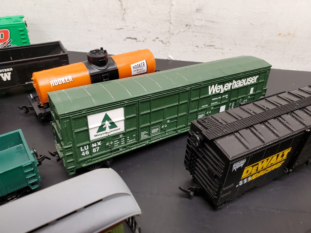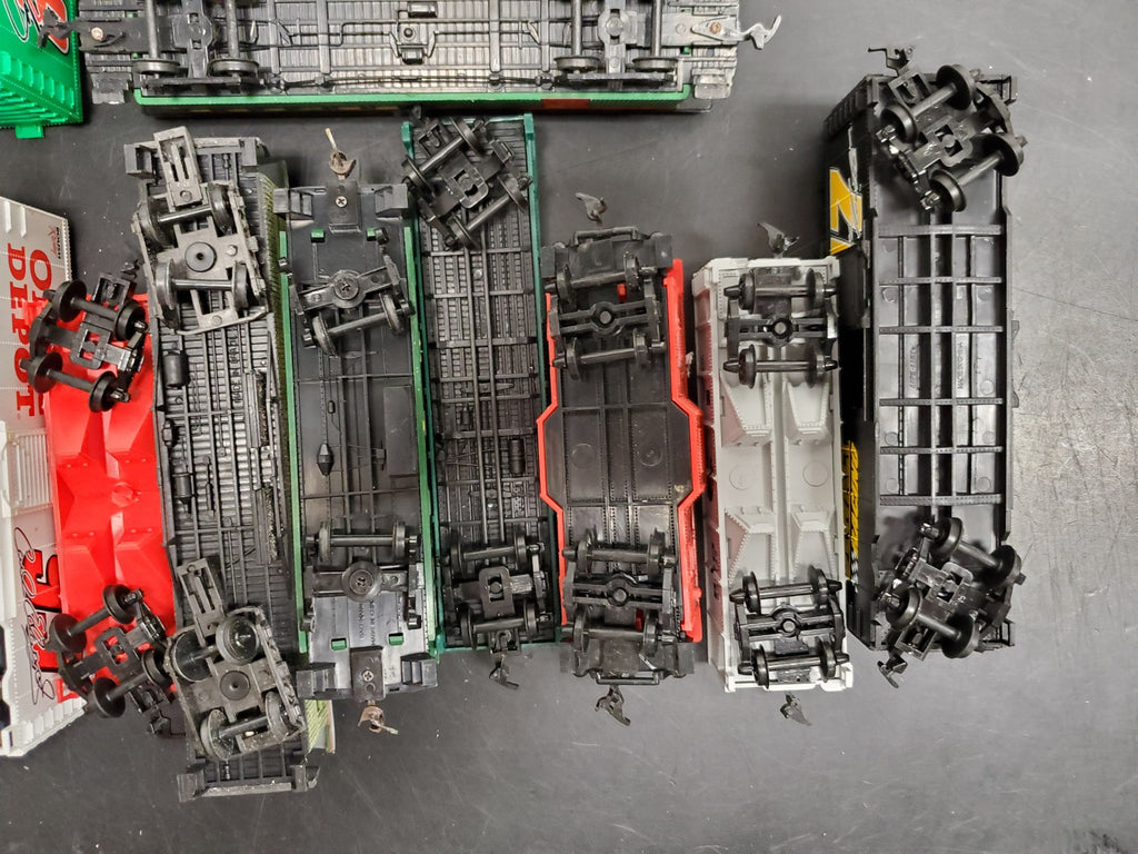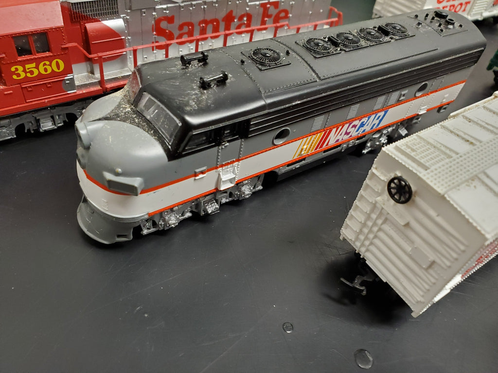 Lot includes 3 Locomotives and 17 Freight Cars, Cabooses, Etc. Racecar Freight Cars as well.