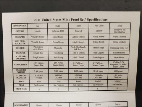 2011 United States Mint Proof Set W/Cert. Of Auth. & Specs Info Coin Col. VF