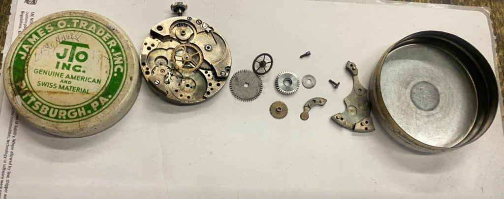 20's James O TRADER JTO Swiss American Watch PARTS advertising TIN PGH Pocket