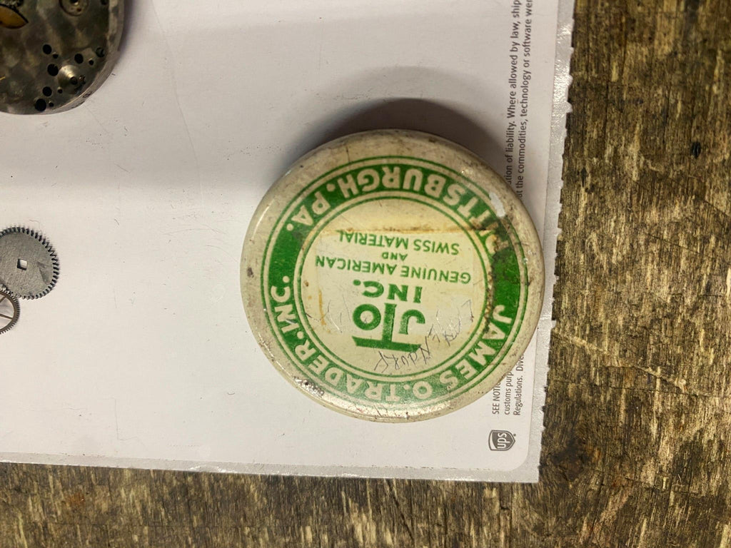 20's James O TRADER JTO Swiss American Watch PARTS advertising TIN PGH Pocket not sure what model their for   come with tin      Great little collectible for the shelf!