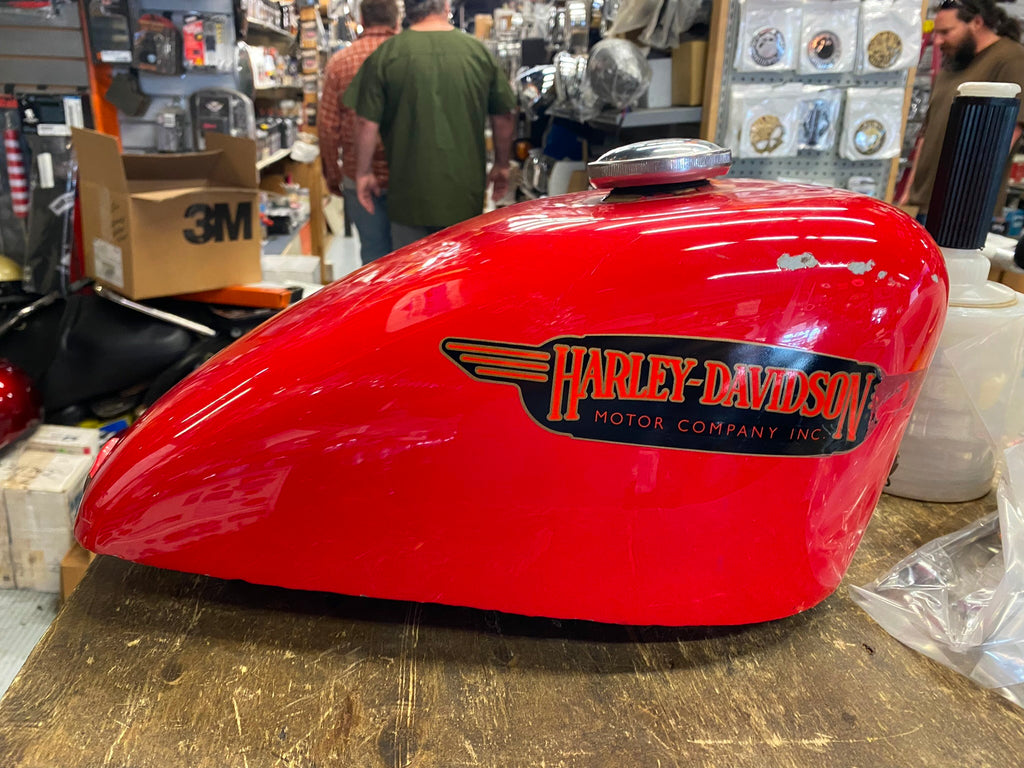 3.1 Gallon Sportster Peanut Gas tank Harley 1982-2003 Chopper Ironhead Shovelhead     nice touch of patina... old fxrt tank decals... not dented.. looks like cables hit edges..