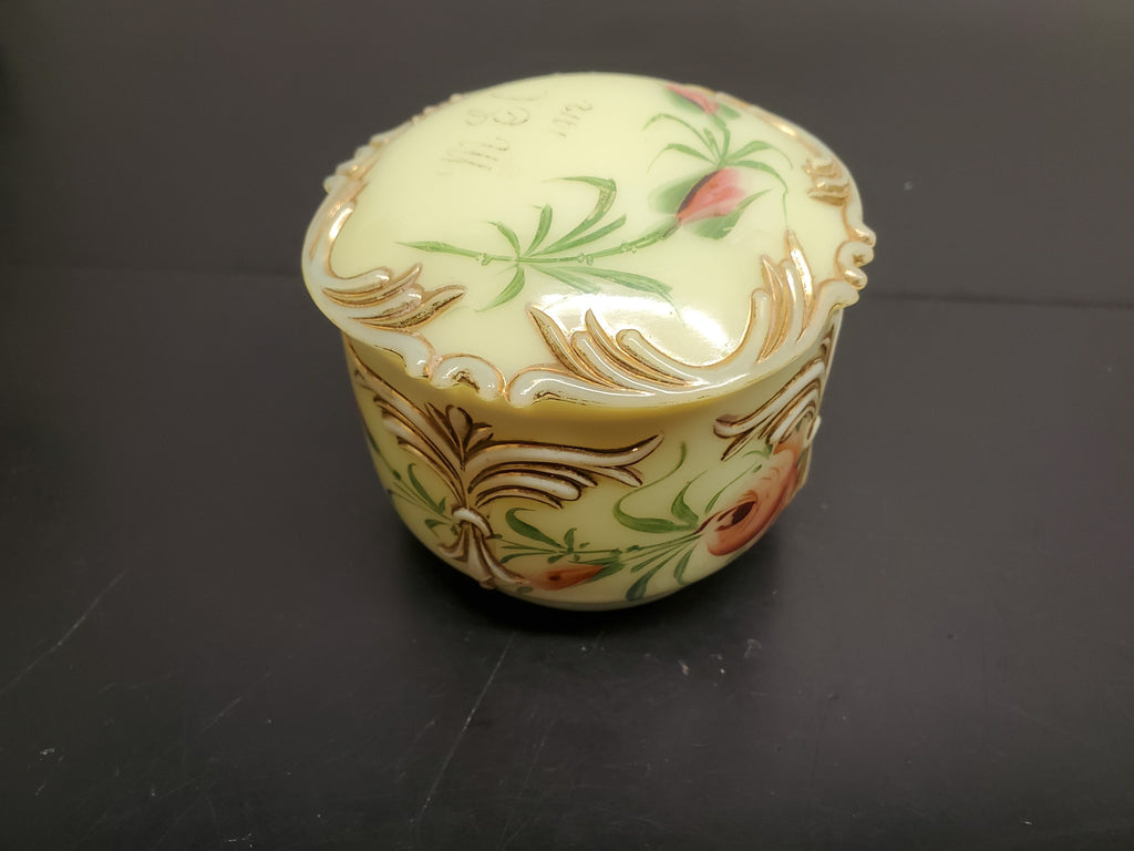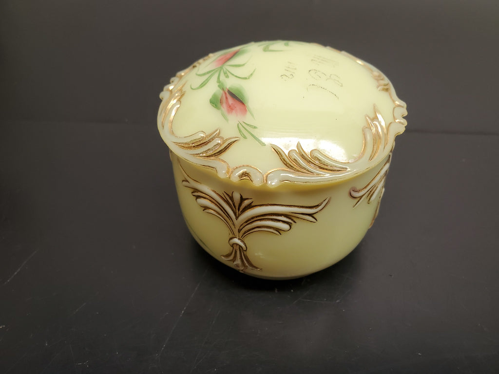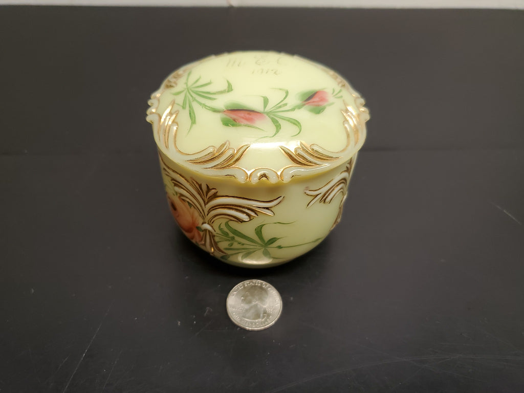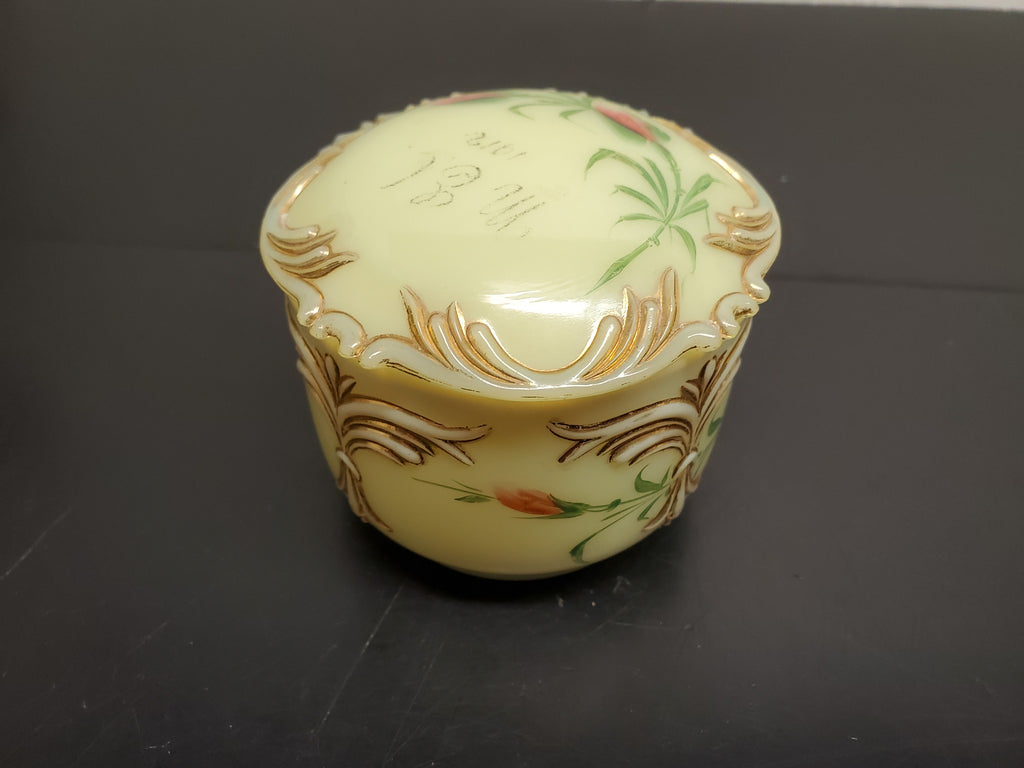 Antique 1912 Custard Glass Container W/ Ornate Lid Gorgeous Gold Flower Pattern!
