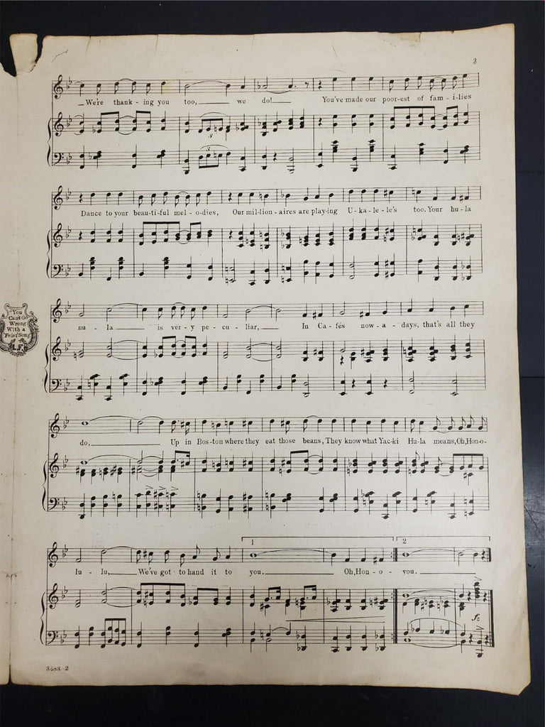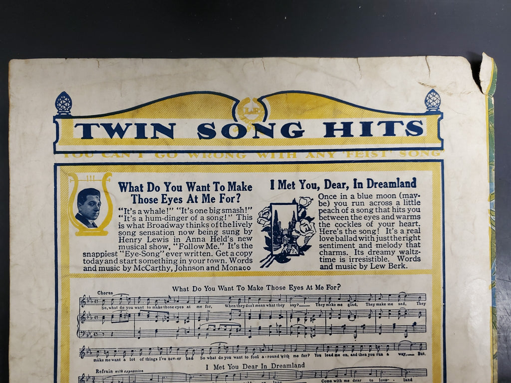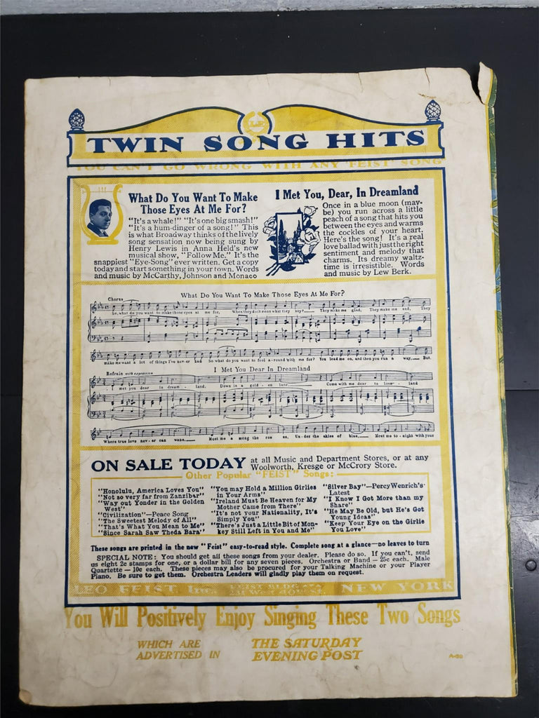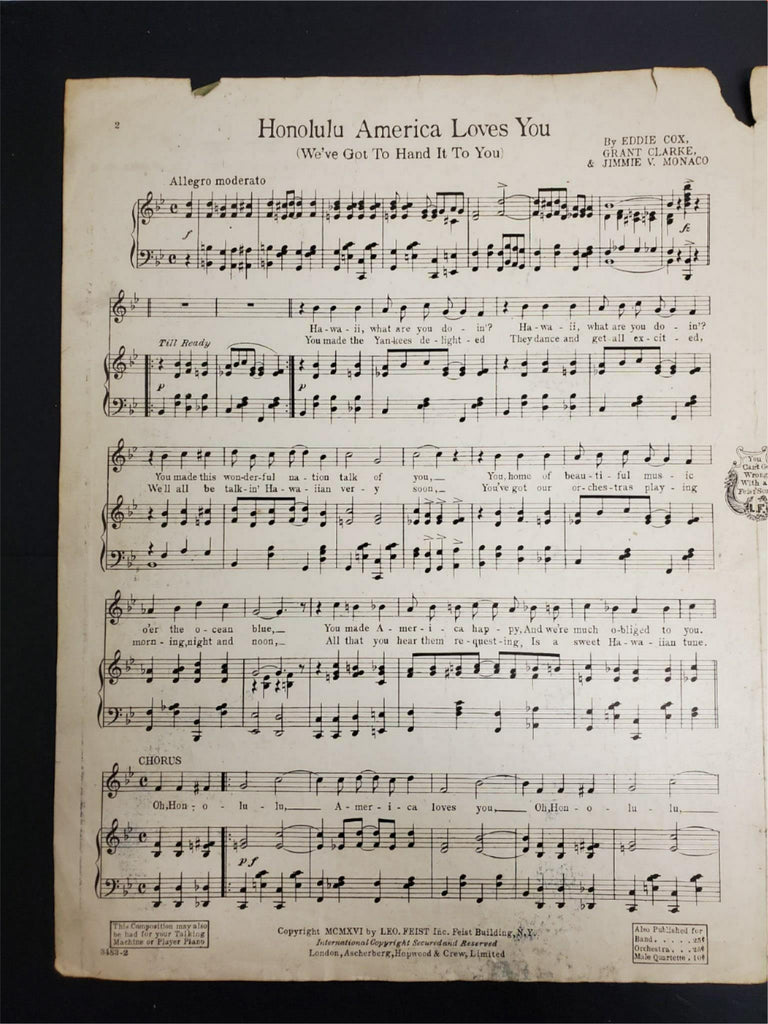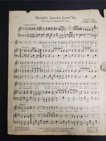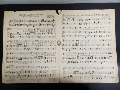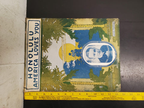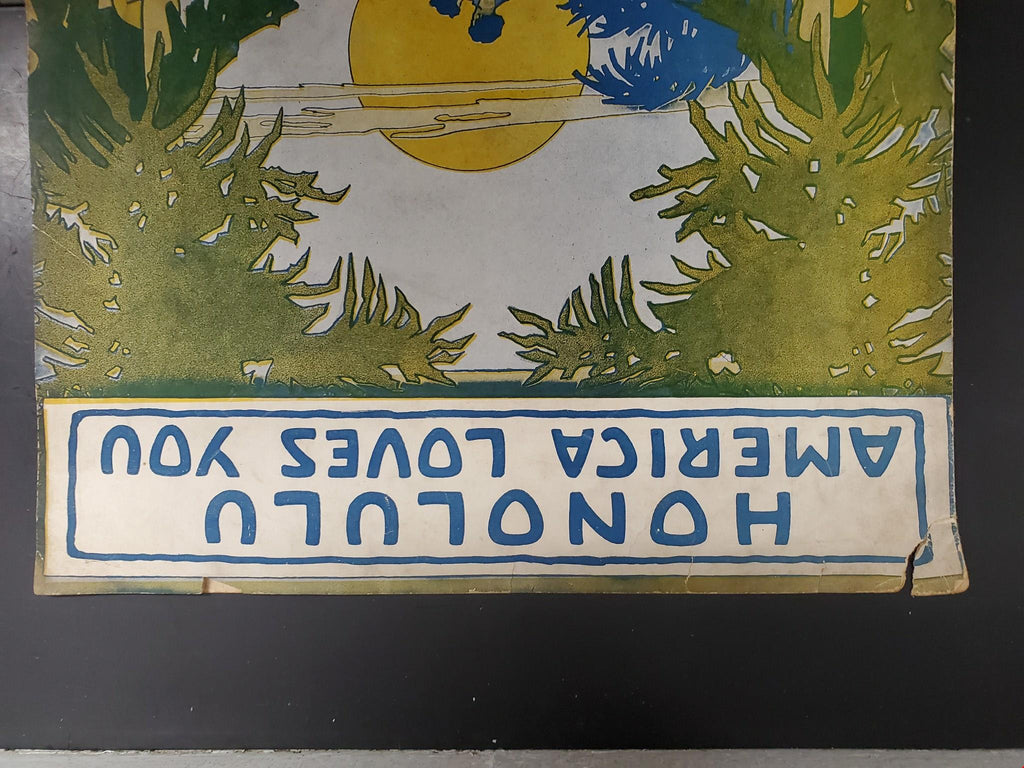 Antique WW1 1916 Sheet Music Honolulu America Loves You Decorative Artwork Piece
