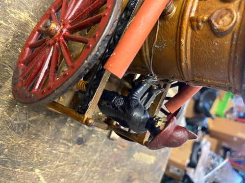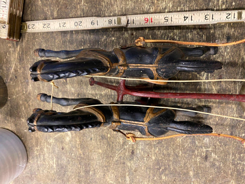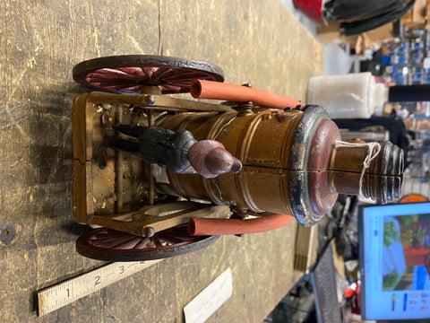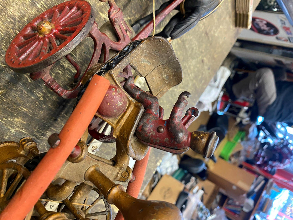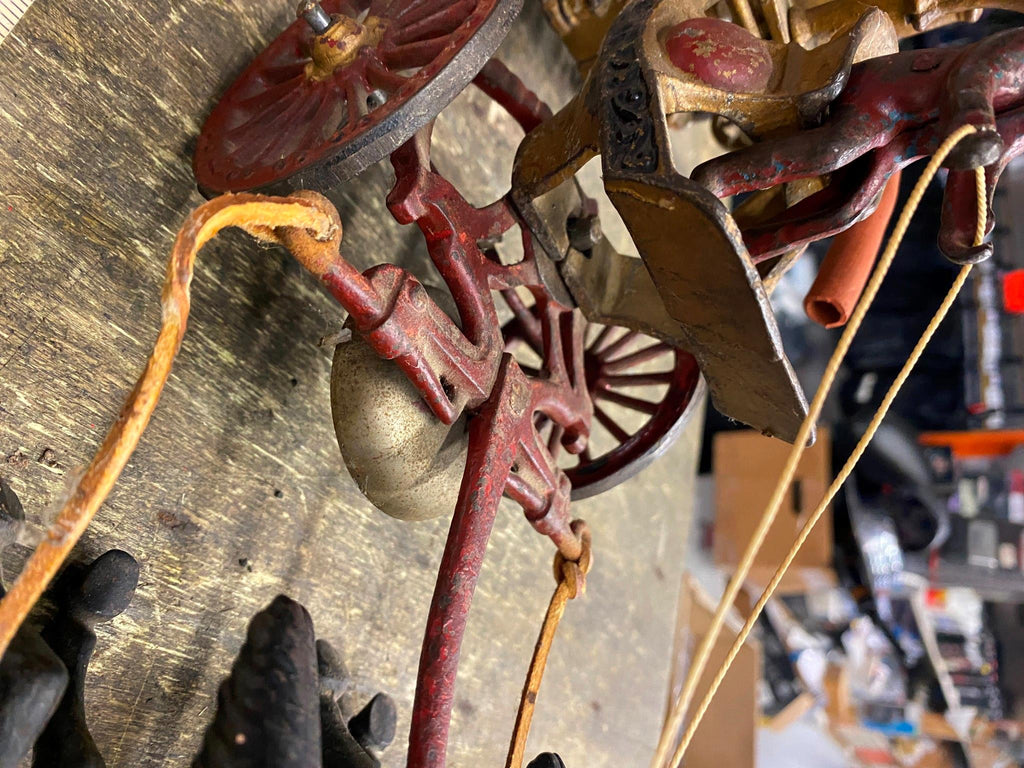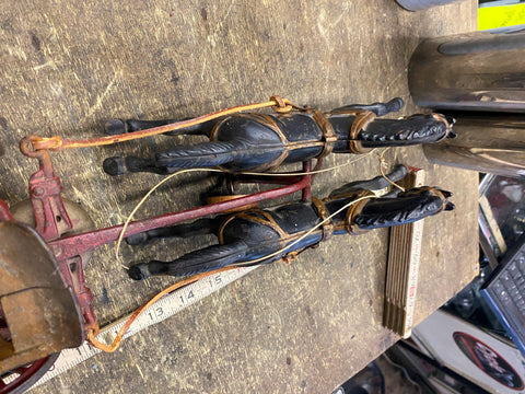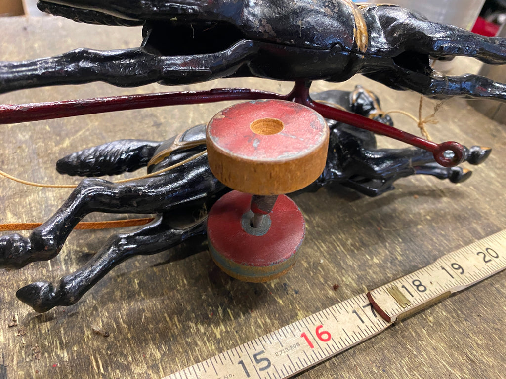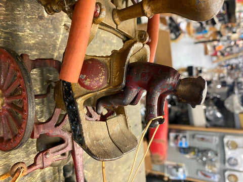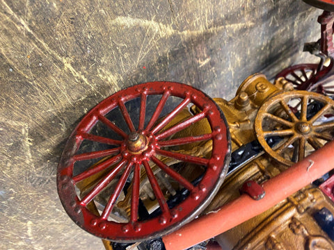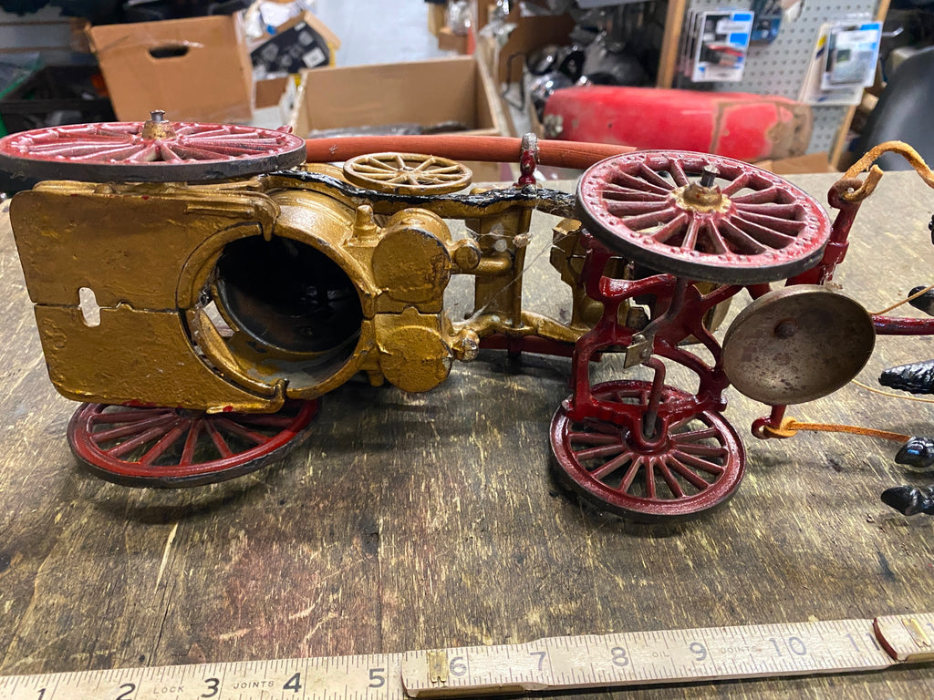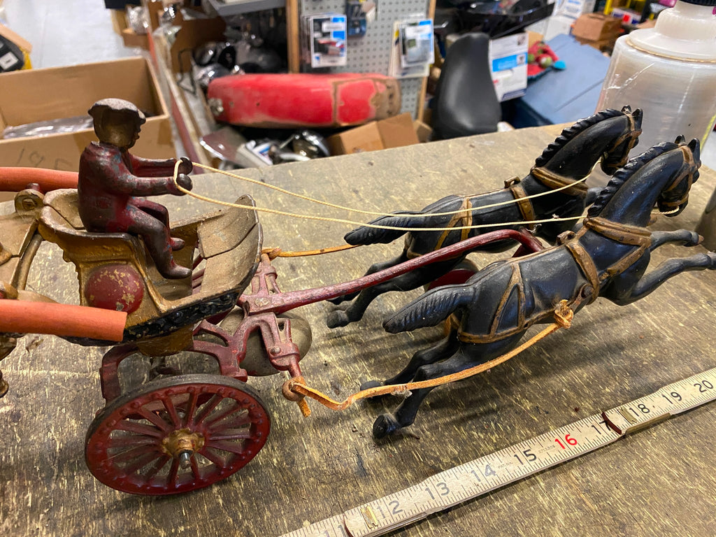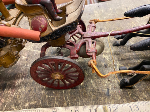 Cast Iron Toy fire Truck Carriag Horses Firemen Pumper 1920's 22" Nice Survivor!!! Large Rare one!!! Very nice condition with riders, looks like someone redid it at some time, dont think leather wouldve lasted this long.... guessing it was redone decades ago! Great Piece for the collecor!! Never see them this nice!! Real mccoy Probably 100 years old!!