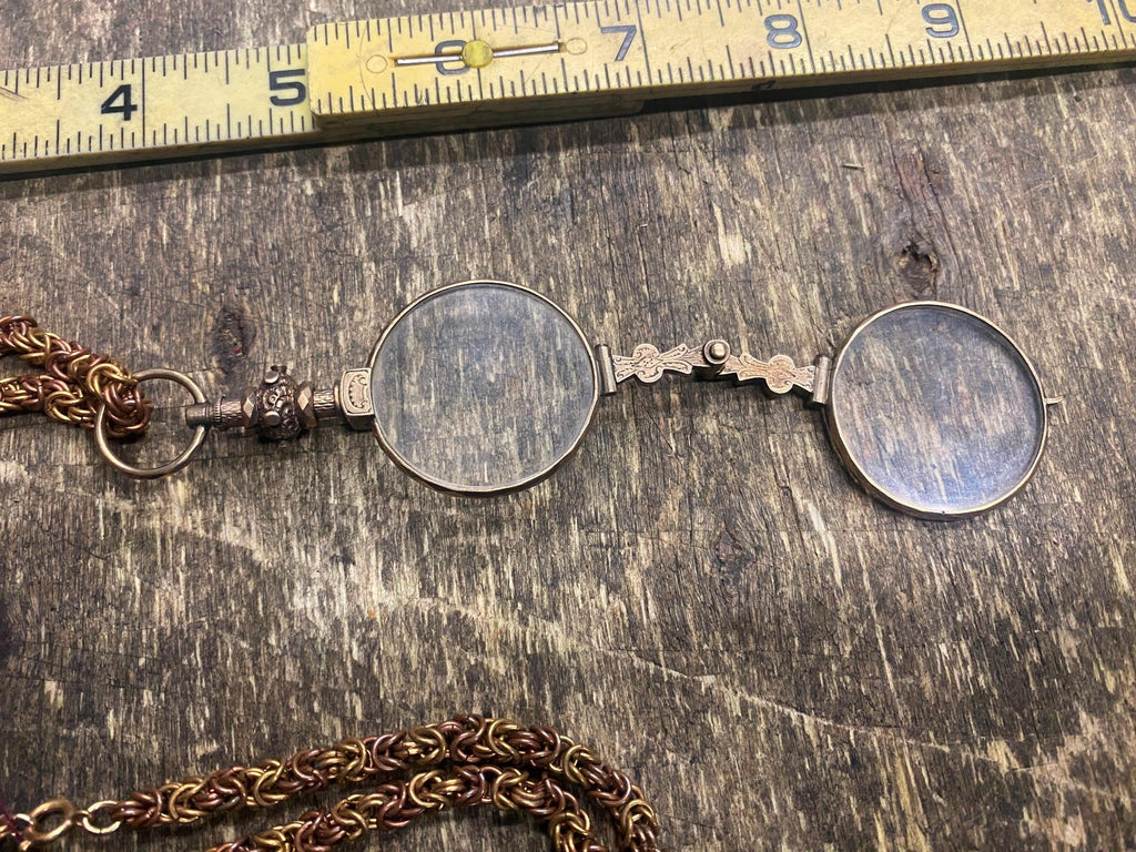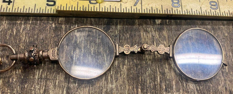 Antique Victorian Gold Filled Karat Lorgnette Opera Glasses Ornate Fashion Social Pretty Fancy glasses, fold in 1/2. Fancy chain with rose.The fancier the glasses the higher social standard you were. Guessing mid 1860's. Some info we found about them.