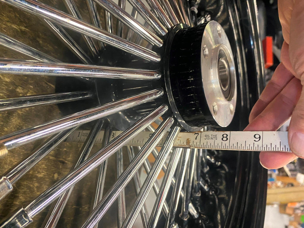 Hub is about 7.5" wide. Rim is measured from inside to inside of the rim lip.