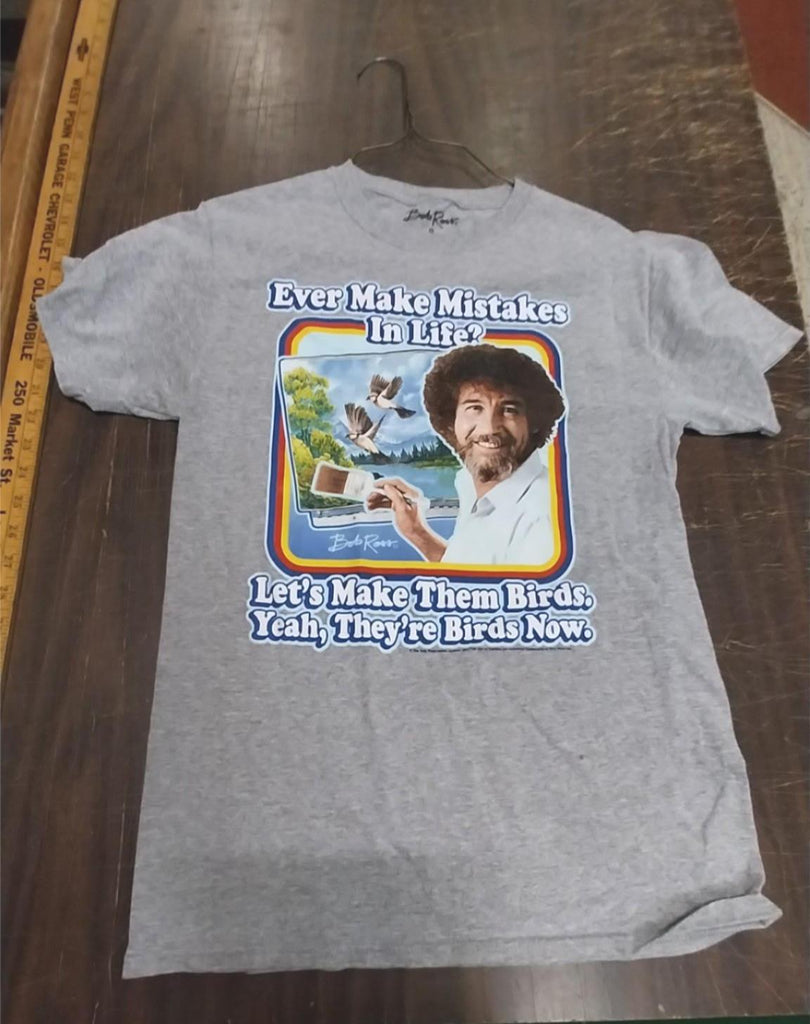 Bob Ross Small Grey T-shirt Painting Lets Make Them Birds Landscape Color
