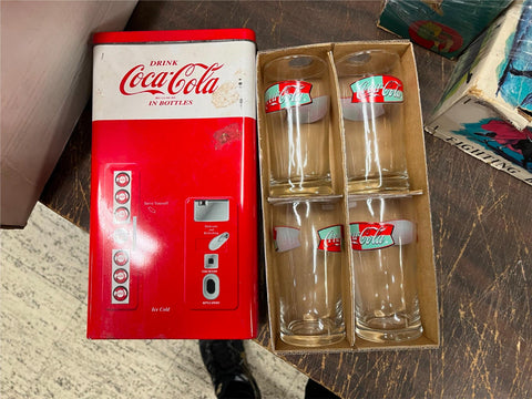Coca Cola 1999 4 piece 8oz Glass Set With Coke Machine Tin Anchor Hoking