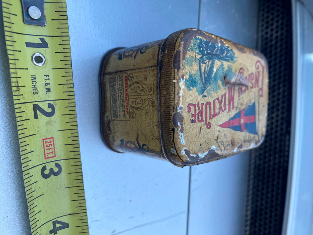 • ENSIGN MIXTUREANTIQUE TOBACCO TIN (c. Late 1800's / Early 1900's)MARBURG BROS. THE AMERICAN TOBACCO CO. (SUCCESSOR) MANUFACTURER BALTIMORE, MD. U.S.A.Images include NY Yacht Club Burgee and an Indian on the side.GINNA & CO. NEW YORK stamp on bottom.Measures approximately 3 1/2" wide x 2 1/8" deep x 2" high.Hinged lid.