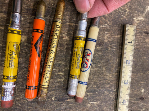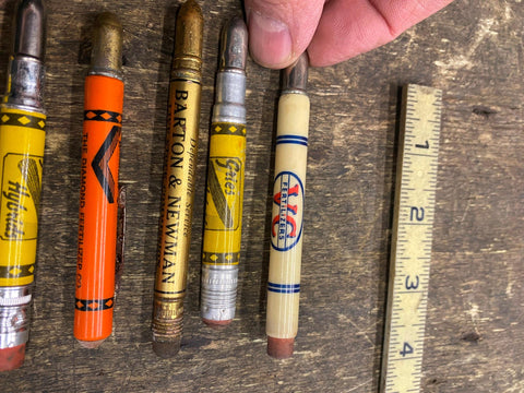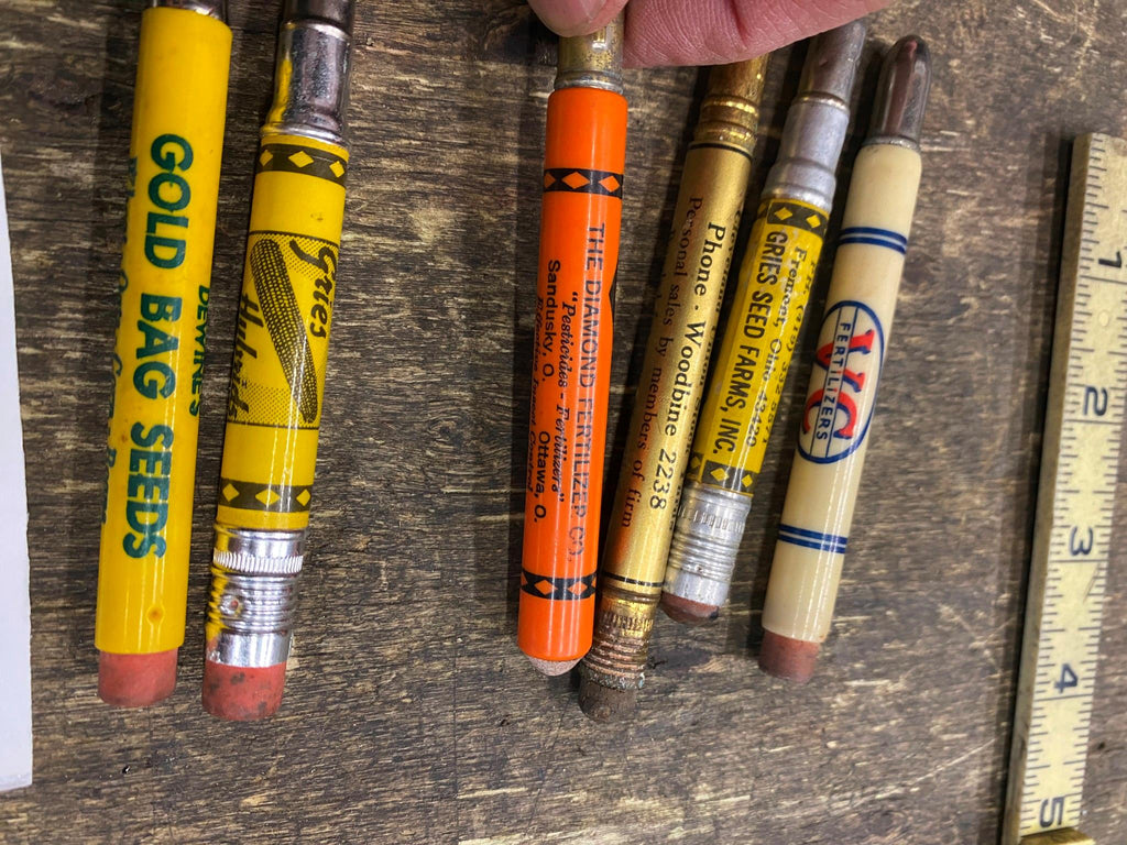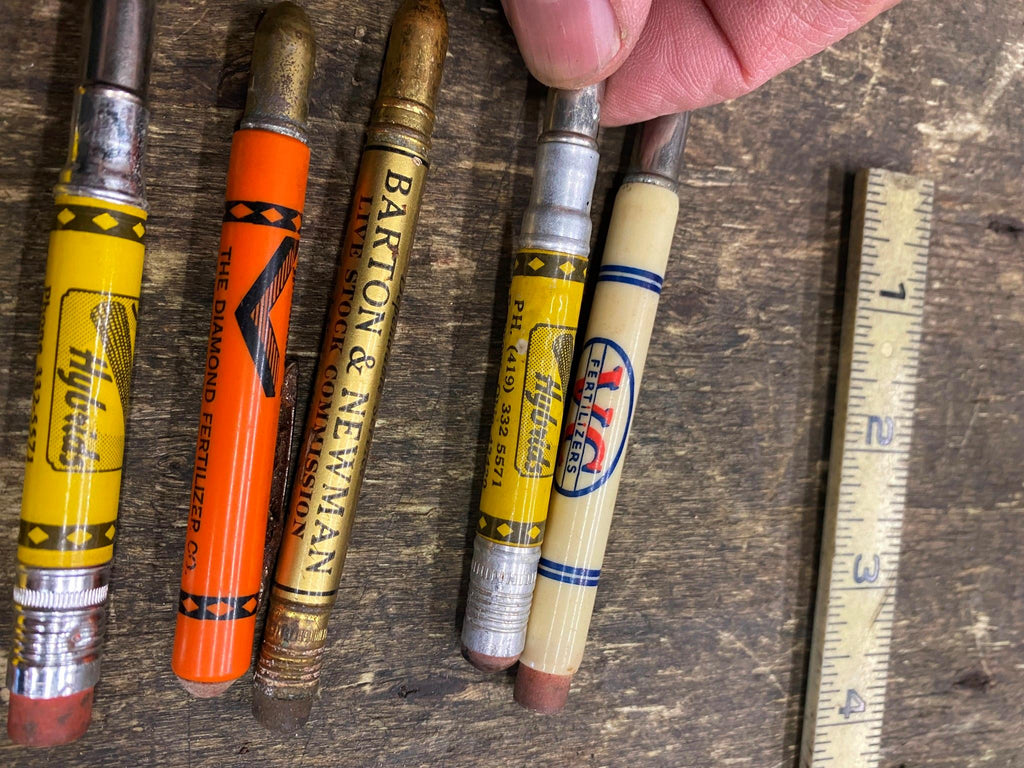 Lot Vtg Advertising Mini Bullet Pencils Farmer Seed Fertilizer Hybrid corn Gries have some different lots of them tried to sort into like sections pulls apart has a small pencil inside lot #2