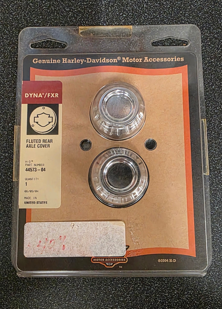 The Harley-Davidson part number 44573-04 is a fluted rear axle nut cover kit designed to fit various Dyna and FXR models from 1991 and later.