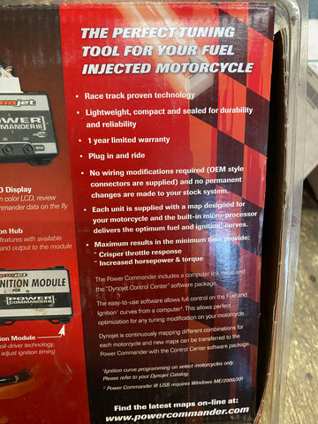 Power Commander III USB Product Introduction The Dynojet Power Commander plugs inline with your bike's stock fuel injection system. It uses OEM (original equipment manufacturer) style connectors making installation easy and quick. The Power Commander III USB allows a full range of fuel adjustment, as much as +/- 100% over stock. Adjustments can be made either with a Windows based computer or by using the face plate mounted button adjusters. No permanent changes are made to the bike's system. Once the unit is removed the bike reverts to its stock settings. Power Commander Map Database Dynojet supports the Power Commander product line with the worlds largest map database. We work with all of the leading exhaust manufacturers from around the globe to bring you pre-tested settings for your motorcycle. No guesswork on your part. Every map that we offer was tested and developed on one of our multiple in house Dynojet Dynamometers using our patented Tuning Link software. New maps are developed weekly for all popular applications.