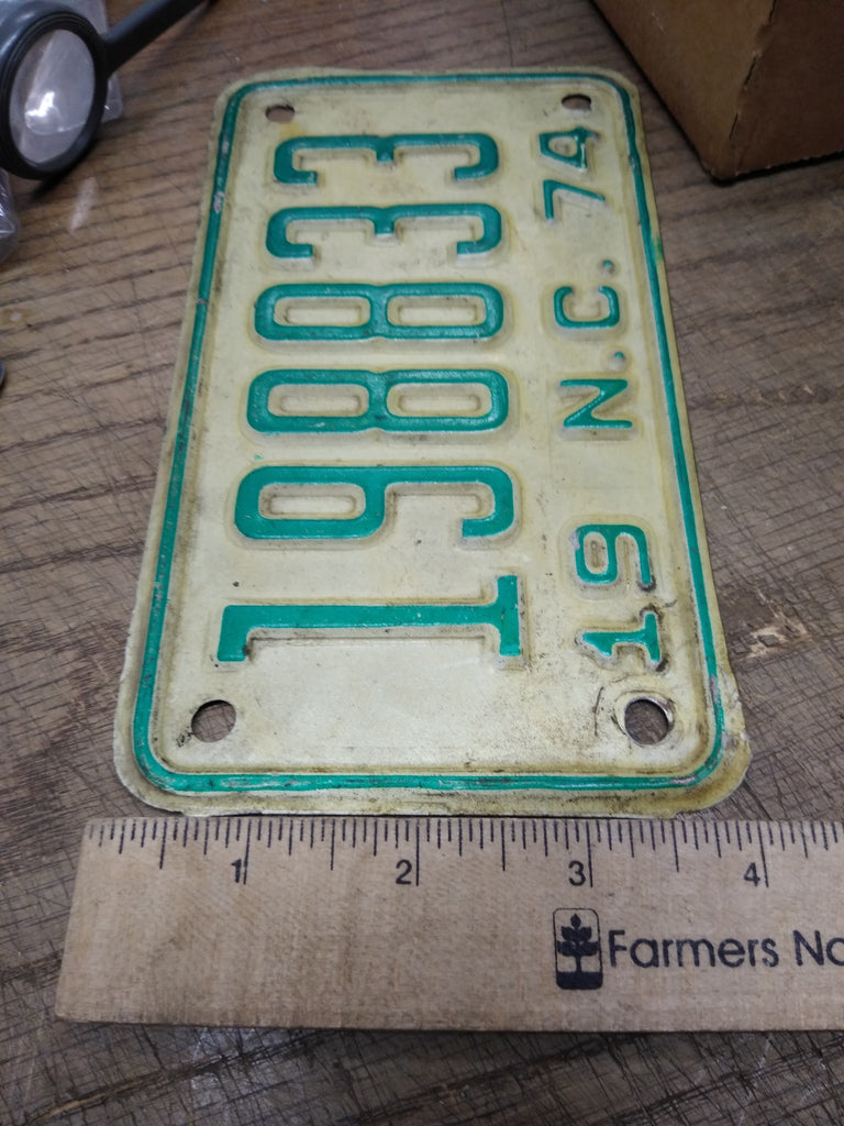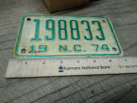 This is a Vintage 1974 NC North Carolina 198833 Motorcycle License Plate Man Cave Rat Bike! ***Selling as pictured. The pictures are a substantial part of the description so please examine all the photos and contact me if you have any questions. We will be happy to save you shipping costs by picking this up at our shop. Thanks for looking.  031424- RK-09