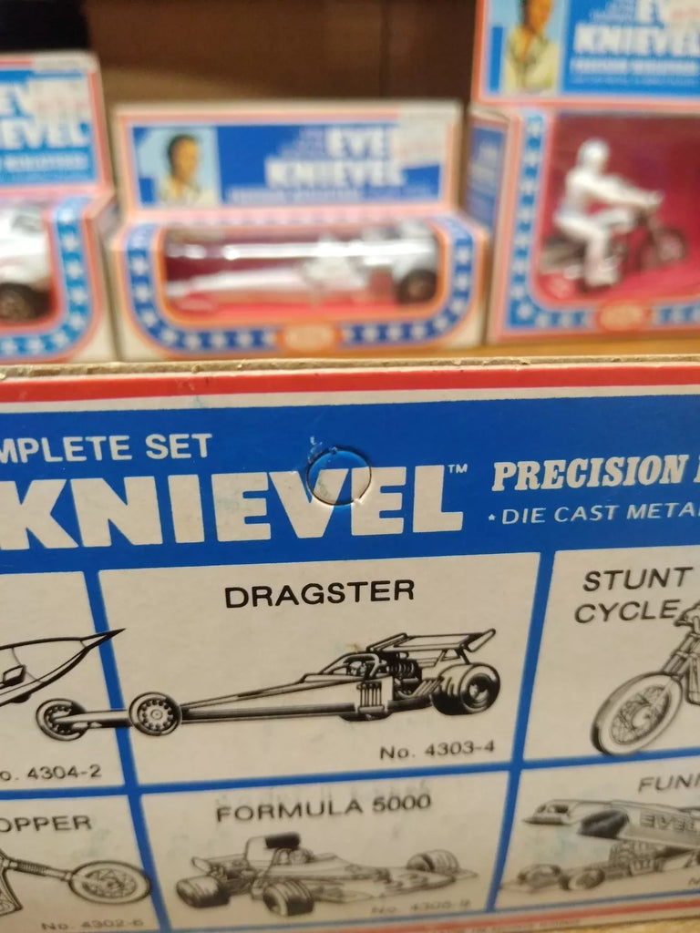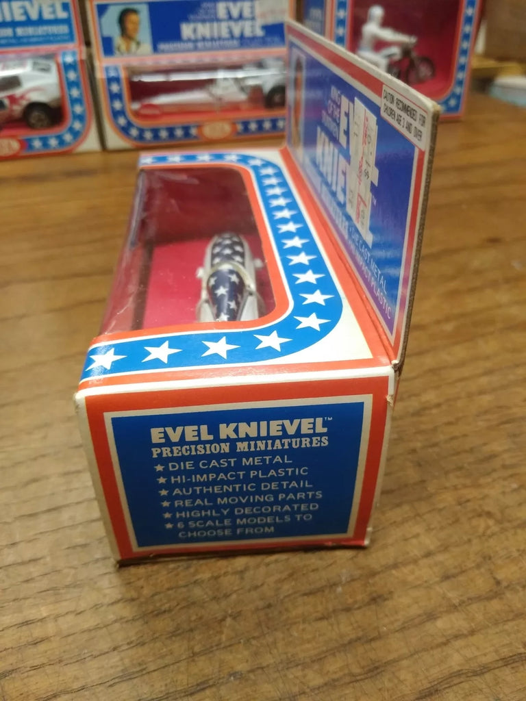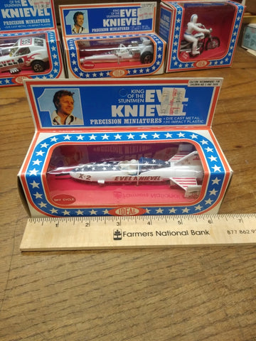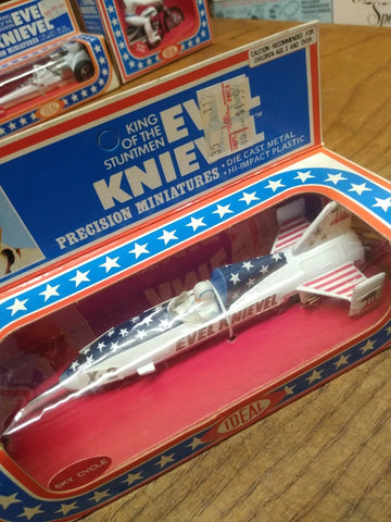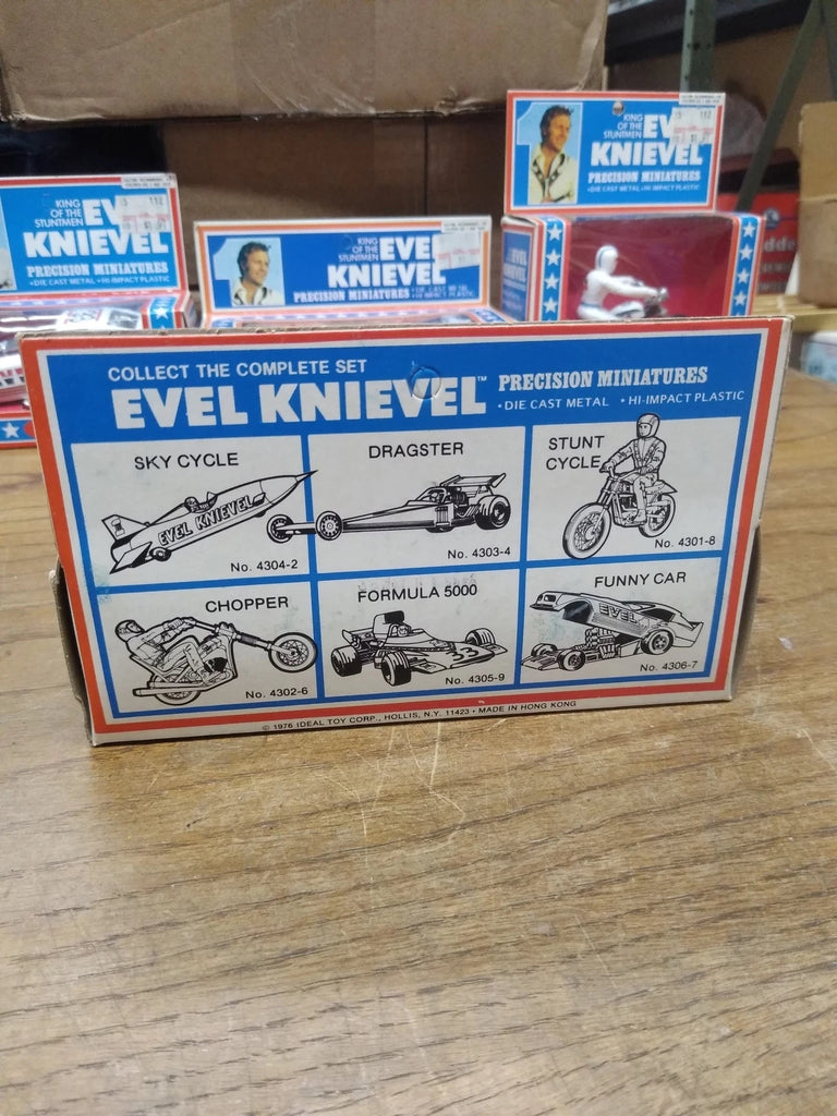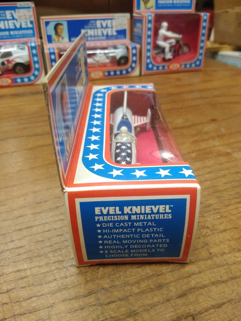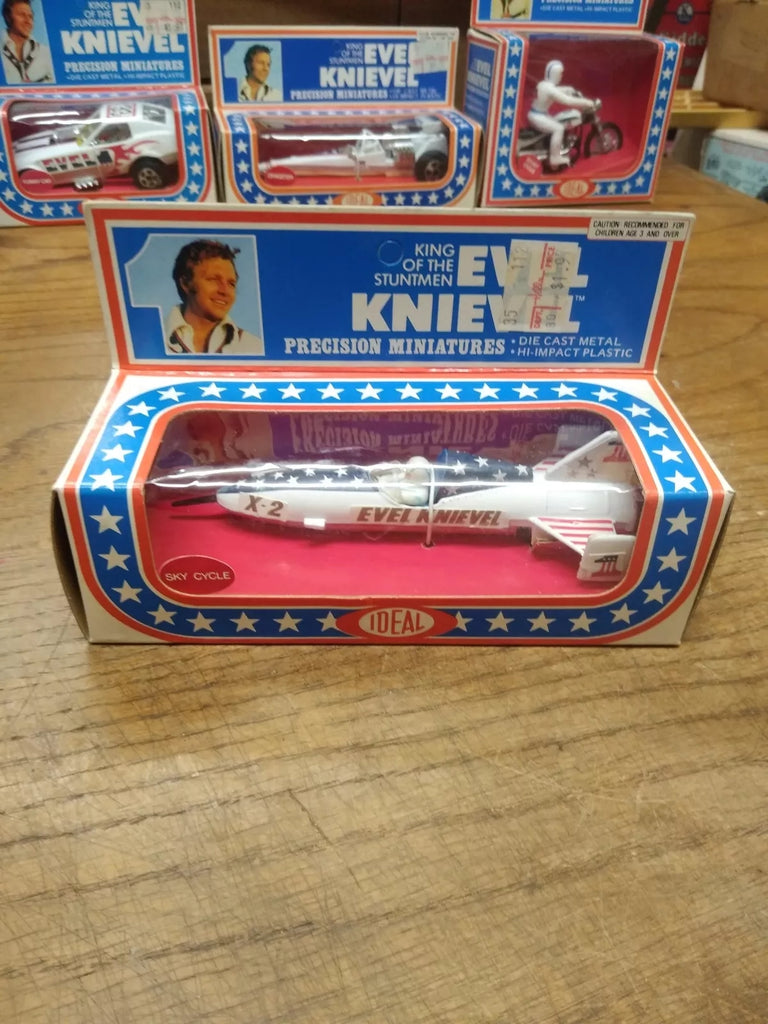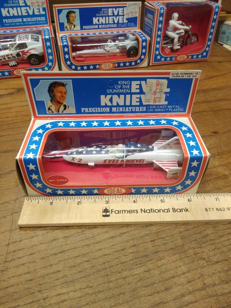 This is a Vtg 1976 Ideal Evel Knievel Precision Miniatures X2 Sky Cycle , Die Cast Metal, High Impact Plastic, NOS Un Punched Original Box MINT!!! The pictures are a substantial part of the description so please examine all the photos and contact me if you have any questions. We will be happy to save you shipping costs by picking this up at our shop. Thanks for looking. 090822-04-RK