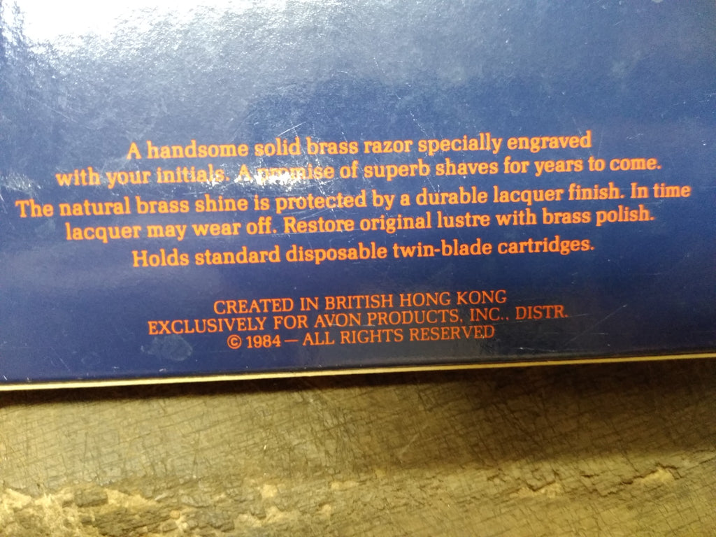 ***PLEASE LOOK AT ALL THE PICTURES AND ASK QUESTIONS BEFORE BIDDING*** This is a Vintage 1984 Avon Solid Brass Twin Blade Cartridge Safety Razor Engraved JWK, *Uses Standard Twin Blades* *** The pictures are a substantial part of the description so please examine all the photos and contact me if you have any questions. We will be happy to save you shipping costs by picking this up at our shop. Thank You 090925-13-RK
