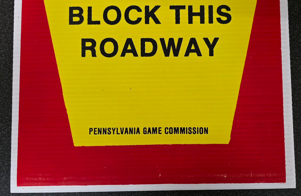 – a symbol of Pennsylvania – bears the warning: "WARNING DO NOT BLOCK THIS ROADWAY PENNSYLVANIA GAME COMMISSION".