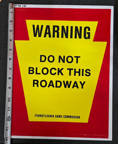 Warning and Purpose: The sign serves as a clear warning from the Pennsylvania Game Commission, stating "WARNING DO NOT BLOCK THIS ROADWAY".