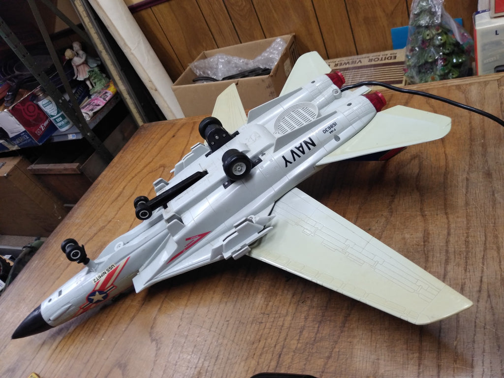 This is a Vintage 1990 New Bright Grumman US NAVY F14 Tomcat Corded Remote Control Fighter Jet. It is Not fully tested, missing battery cover and cockpit canopy, may be missing other parts. The pictures are a substantial part of the description so please examine all the photos and contact me if you have any questions. We will be happy to save you shipping costs by picking this up at our shop. Thanks for looking. 120621-RK-02