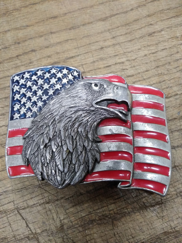 ***PLEASE LOOK AT ALL THE PICTURES AND ASK QUESTIONS BEFORE BUYING*** This is a Vintage 1990 Siskiyou USA Flag and Eagle Red and Blue Enamel Belt Buckle 3.25", Sharp!, Nice Shape! The pictures are a substantial part of the description so please examine all the photos and contact me if you have any questions. We will be happy to save you shipping costs by picking this up at our shop. Thank You 082924- RK-11