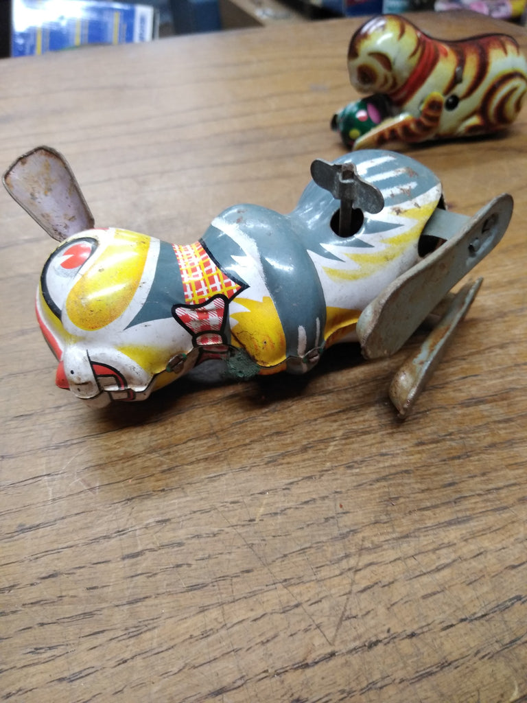 This is a Vintage 2 Piece Wind Up lithograph Tin Toy Lot with a Cat rolling a Ball and a Jumping Rabbit. Rabbit is made in Japan and Working, it is missing an ear and it hops kind of crooked. The cat is unmarked and missing it's key but it seems like it should work if it's wound up. This is a Parts or Repair Lot. The pictures are a substantial part of the description so please examine all the photos and contact me if you have any questions. We will be happy to save you shipping costs by picking this up at our shop. Thanks for looking. 122721-RK-01